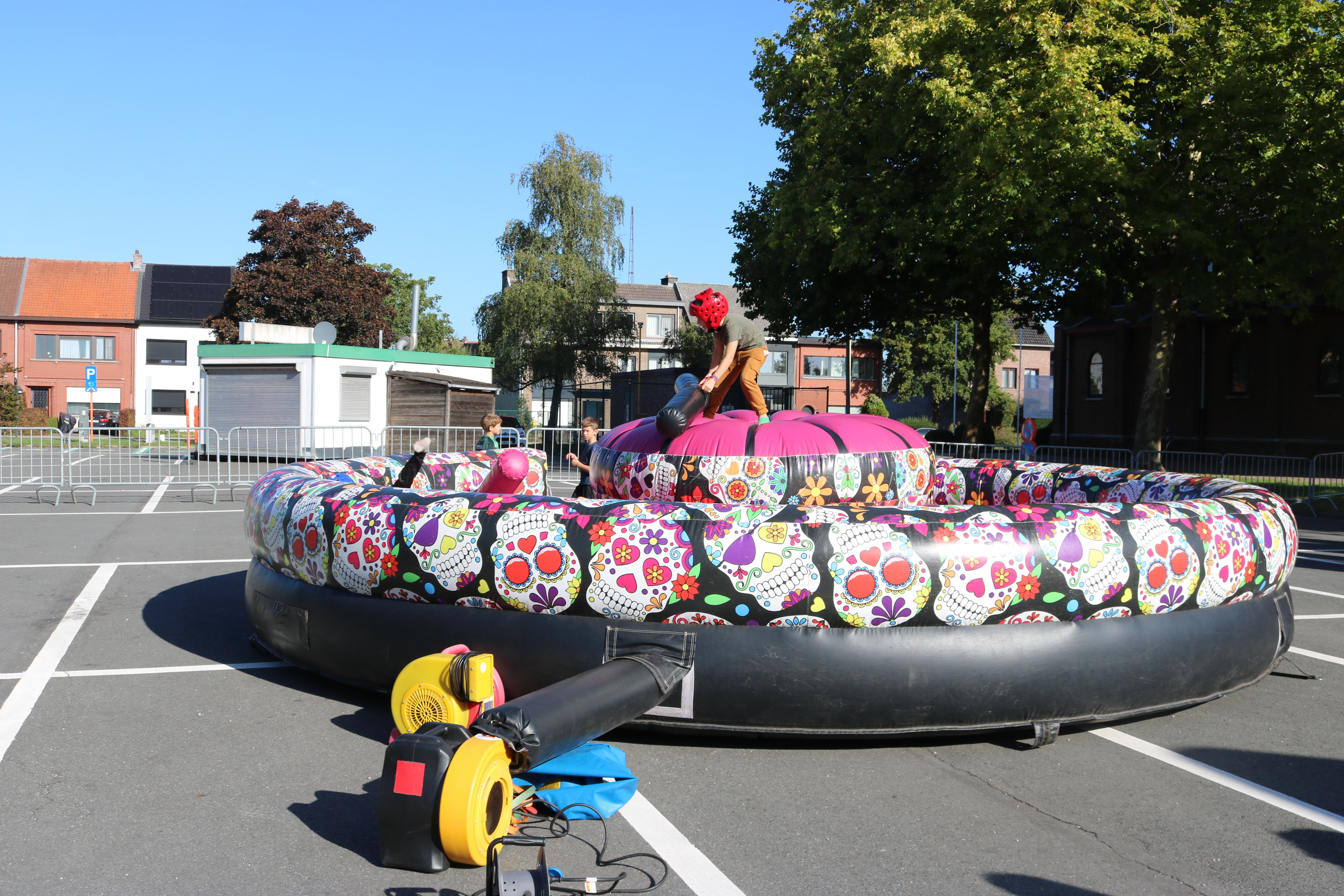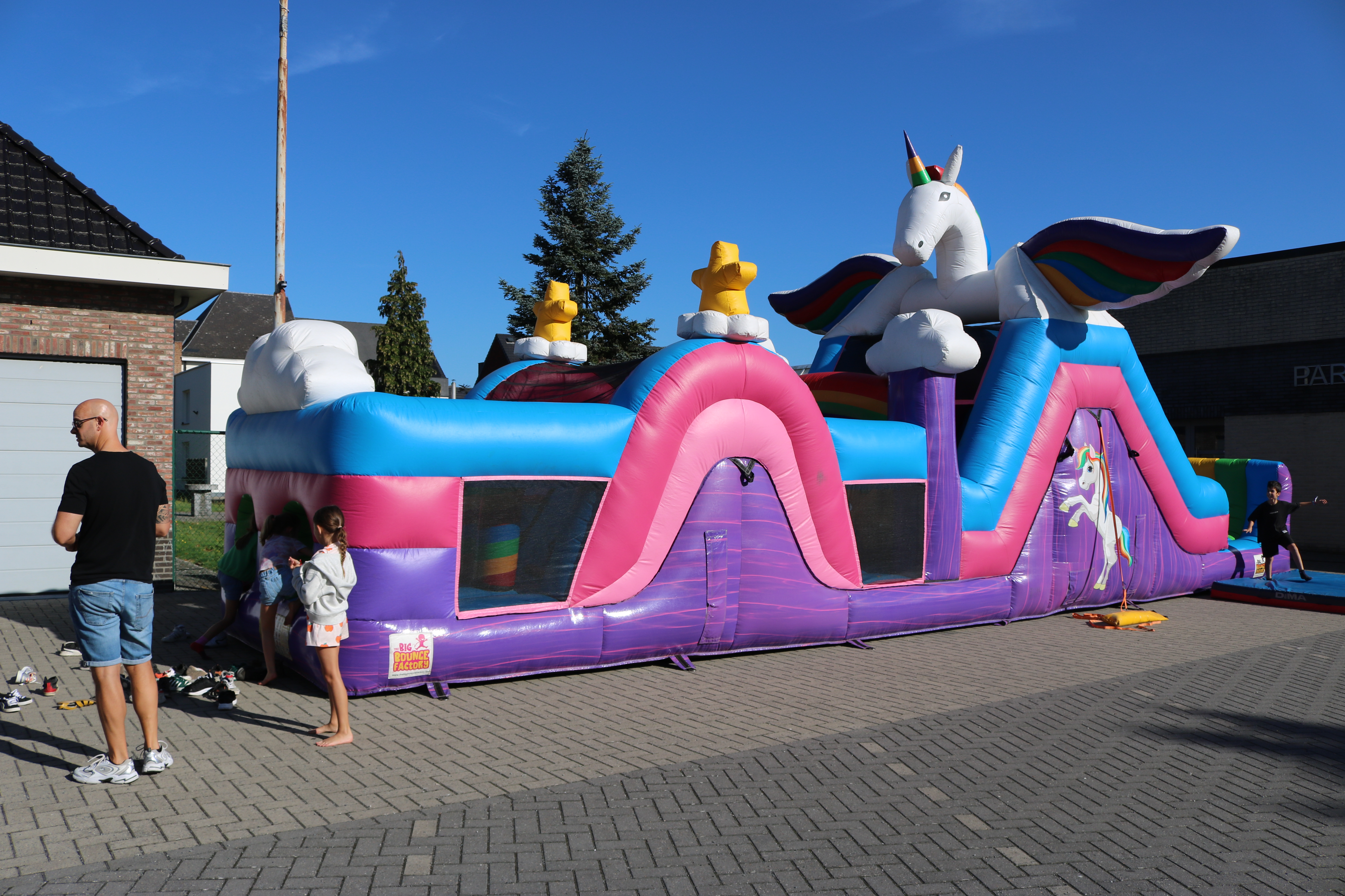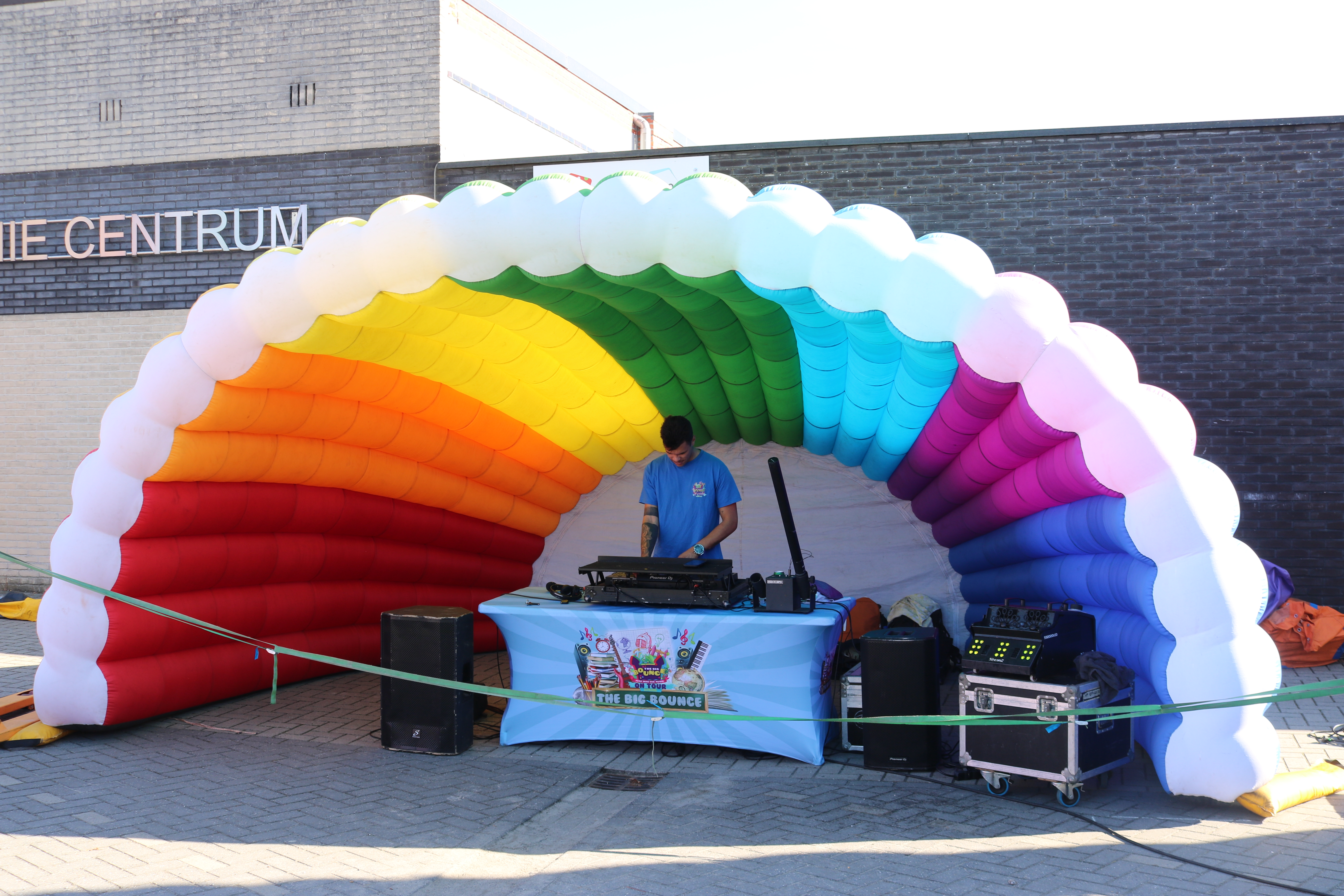 De organisatoren van The Big Bounce (de grote sprong), waren vandaag te gast in Basisschool Pullaar . Ze bouwden op de Rode-Kruisparking parking liefst 9 enorme , kleurrijke springkastelen .
