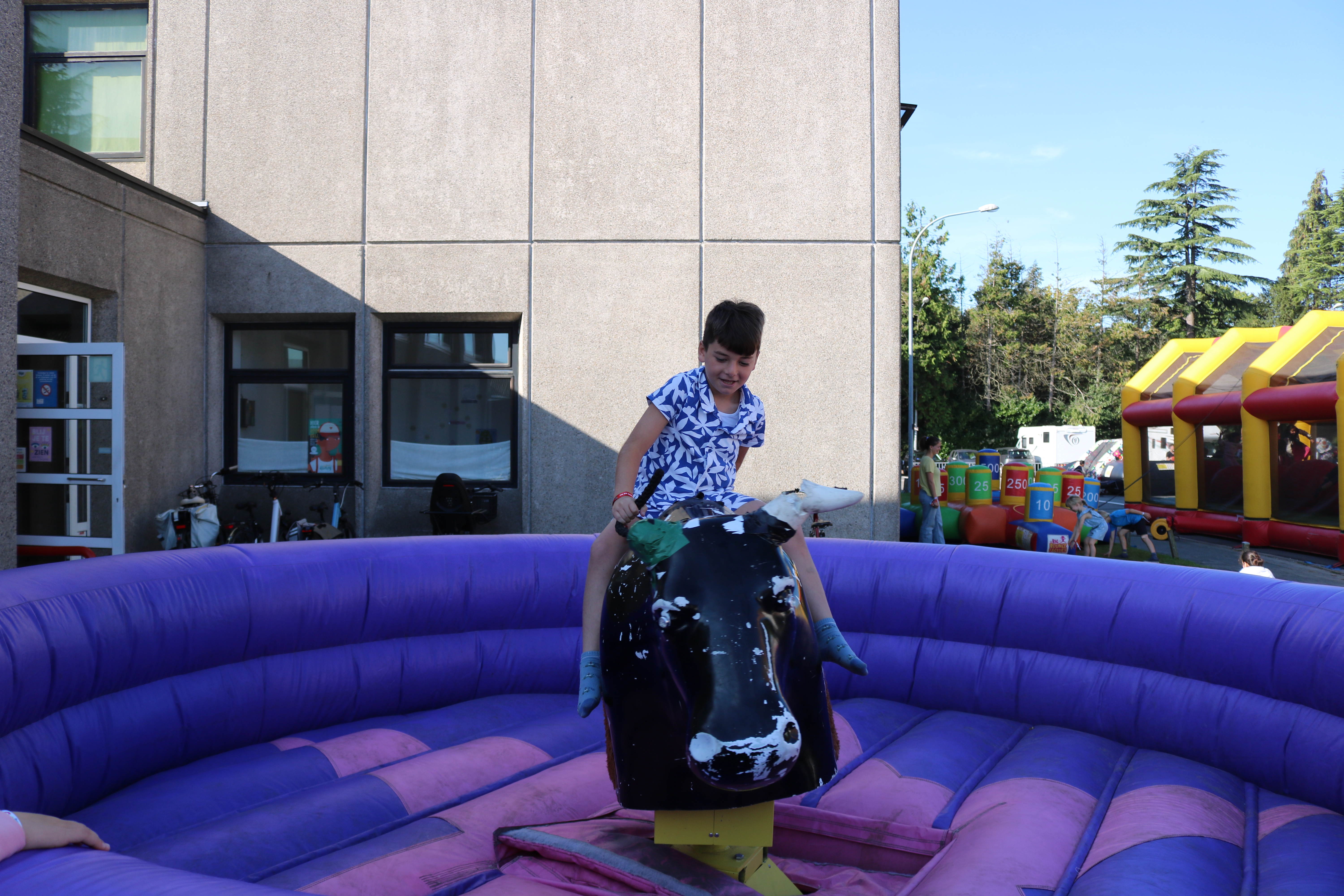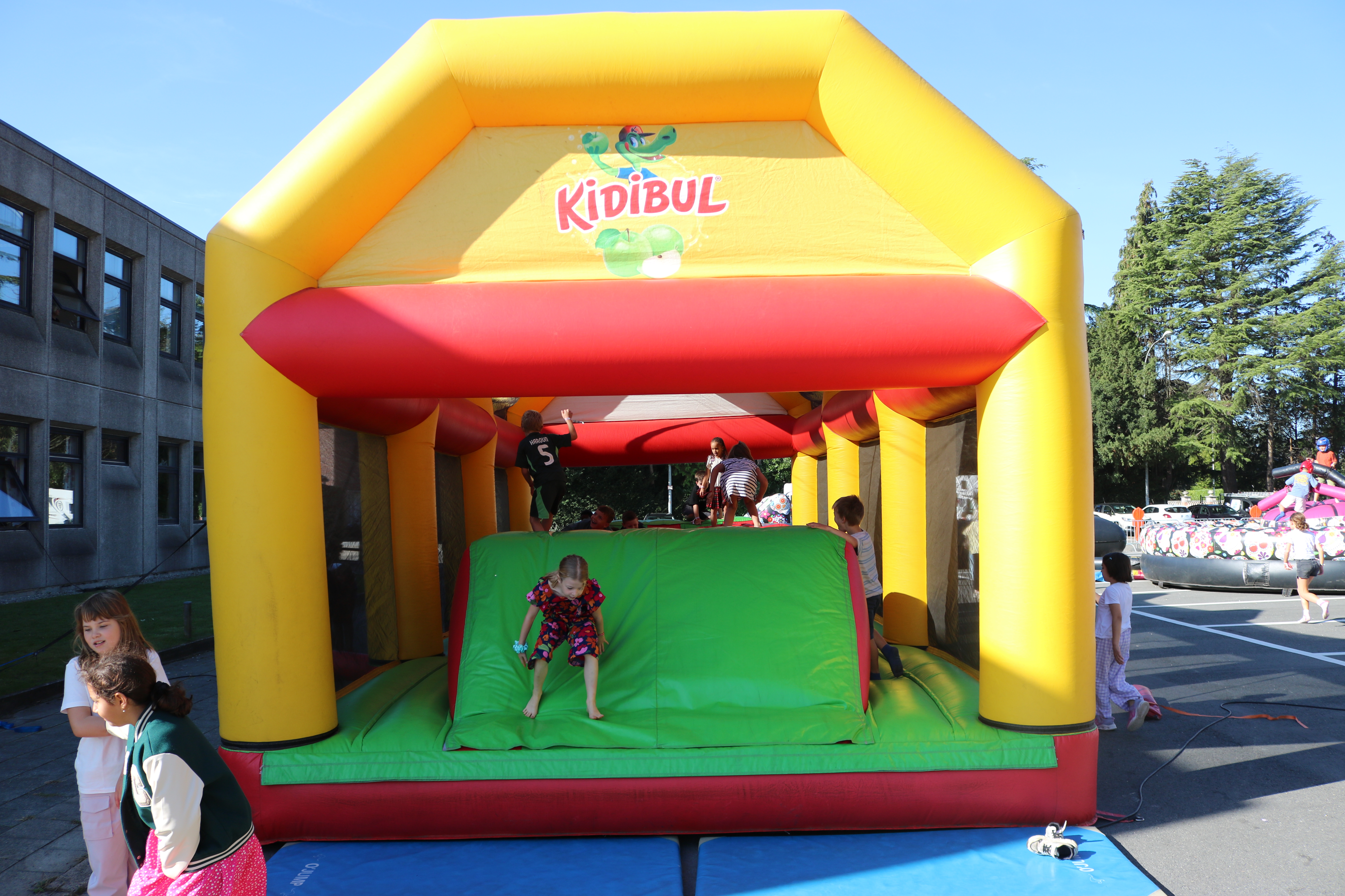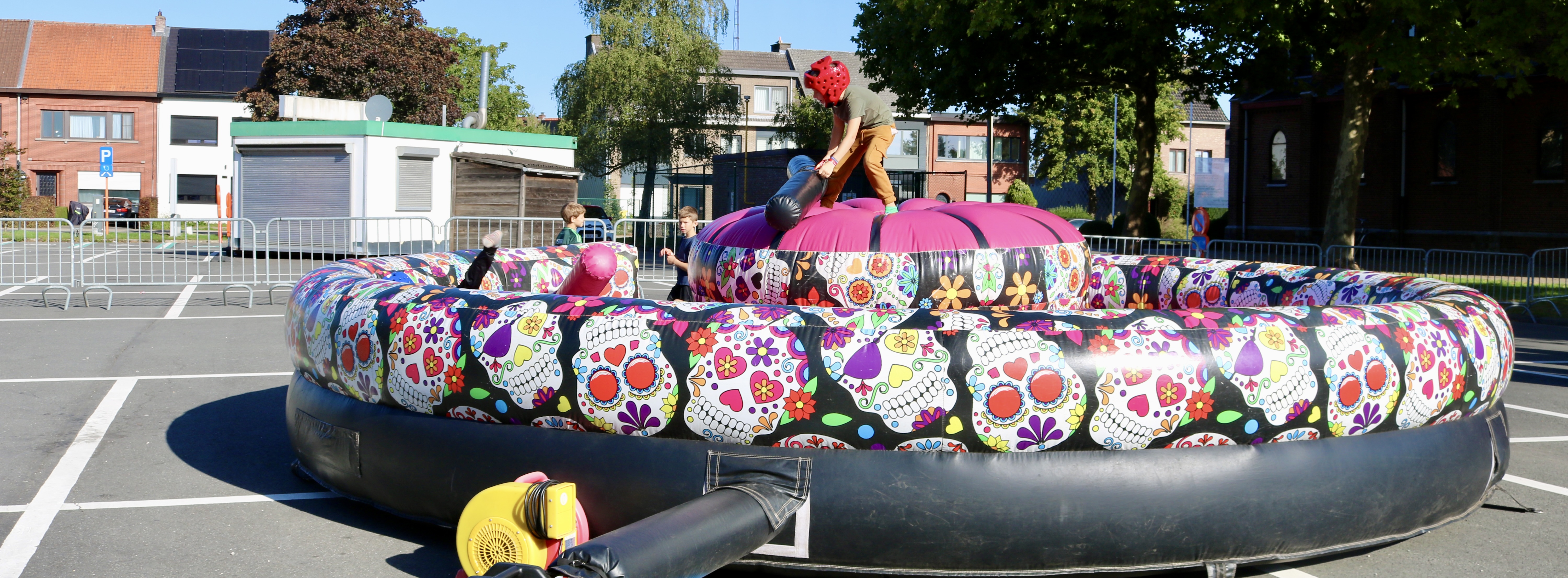De organisatoren van The Big Bounce (de grote sprong), waren vandaag te gast in Basisschool Pullaar . Ze bouwden op de Rode-Kruisparking parking liefst 9 enorme , kleurrijke springkastelen .