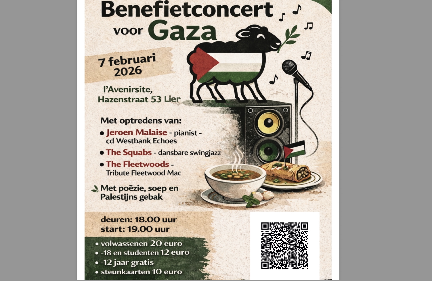 Zaterdag 7 februari 2026 slaat Lier de handen ineen voor het goede doel. Onder de vlag ‘Vrede voor Gaza Lier’ vindt op de ’L Avenir-site een bijzonder benefietconcert plaats. De volledige opbrengst gaat via lokale Palestijnse families en Mondiale Werken Lier rechtstreeks naar de wederopbouw van Gaza.