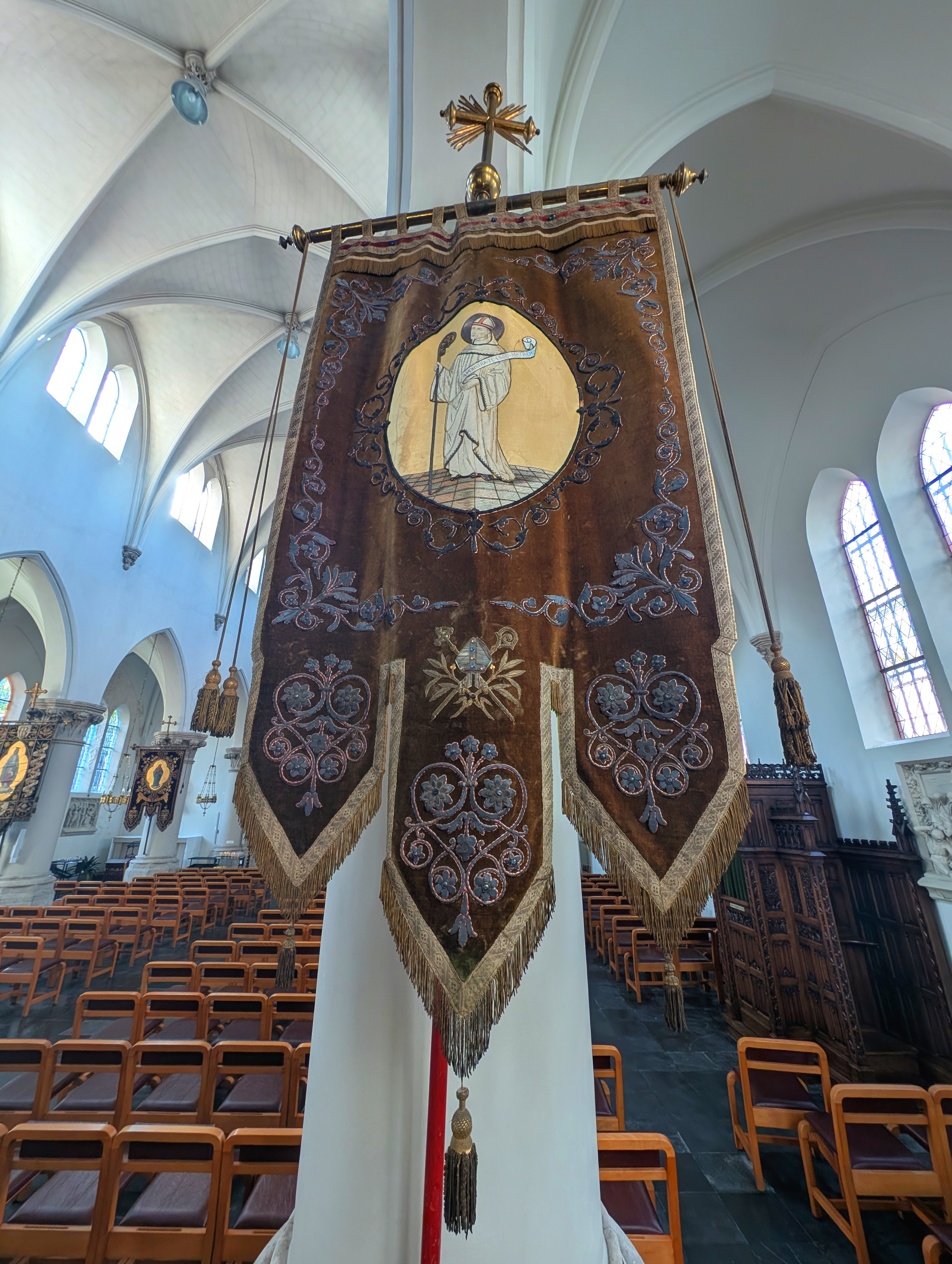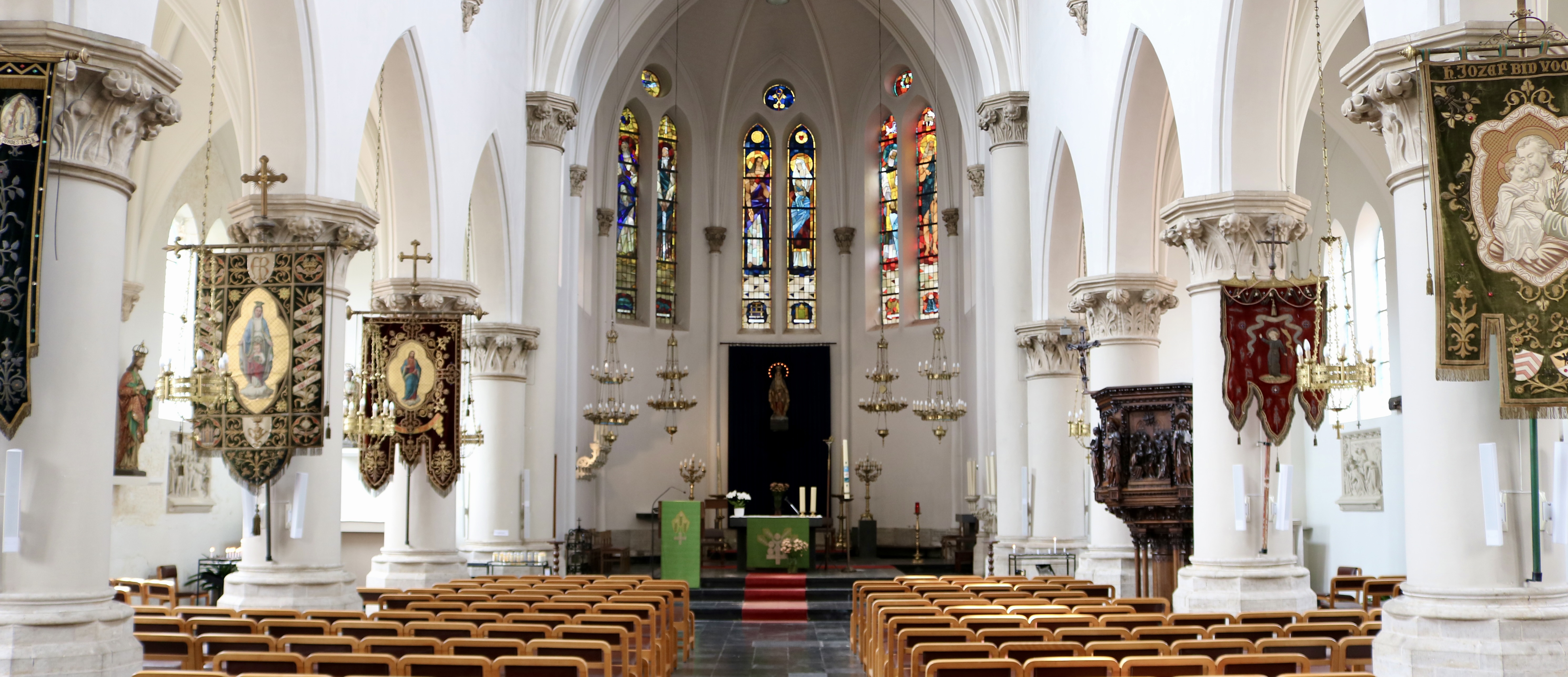 De historische , neogotische vaandels dateren uit de tijd dat de kerk gebouwd werd, ze werden in alle processies meegedragen .
