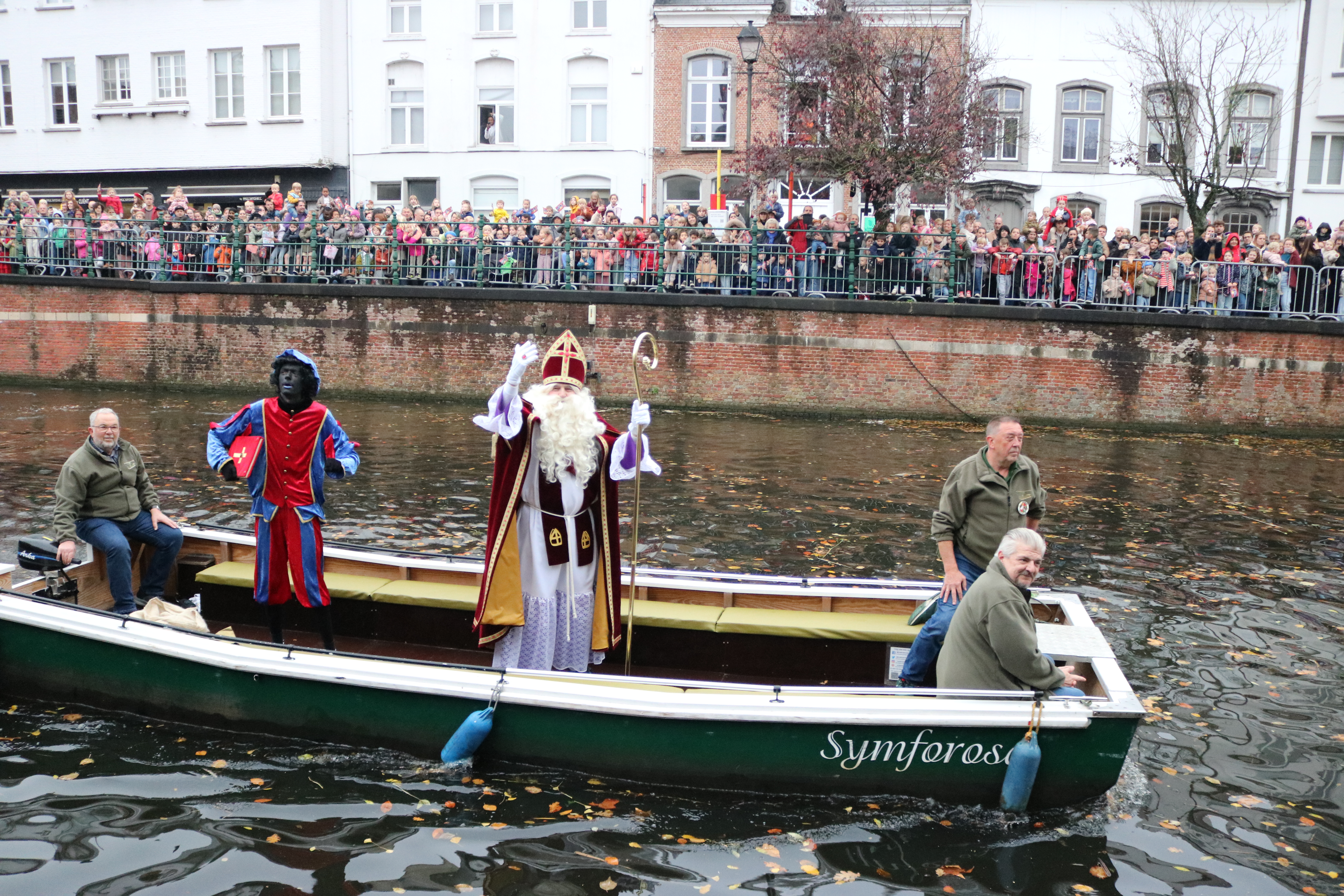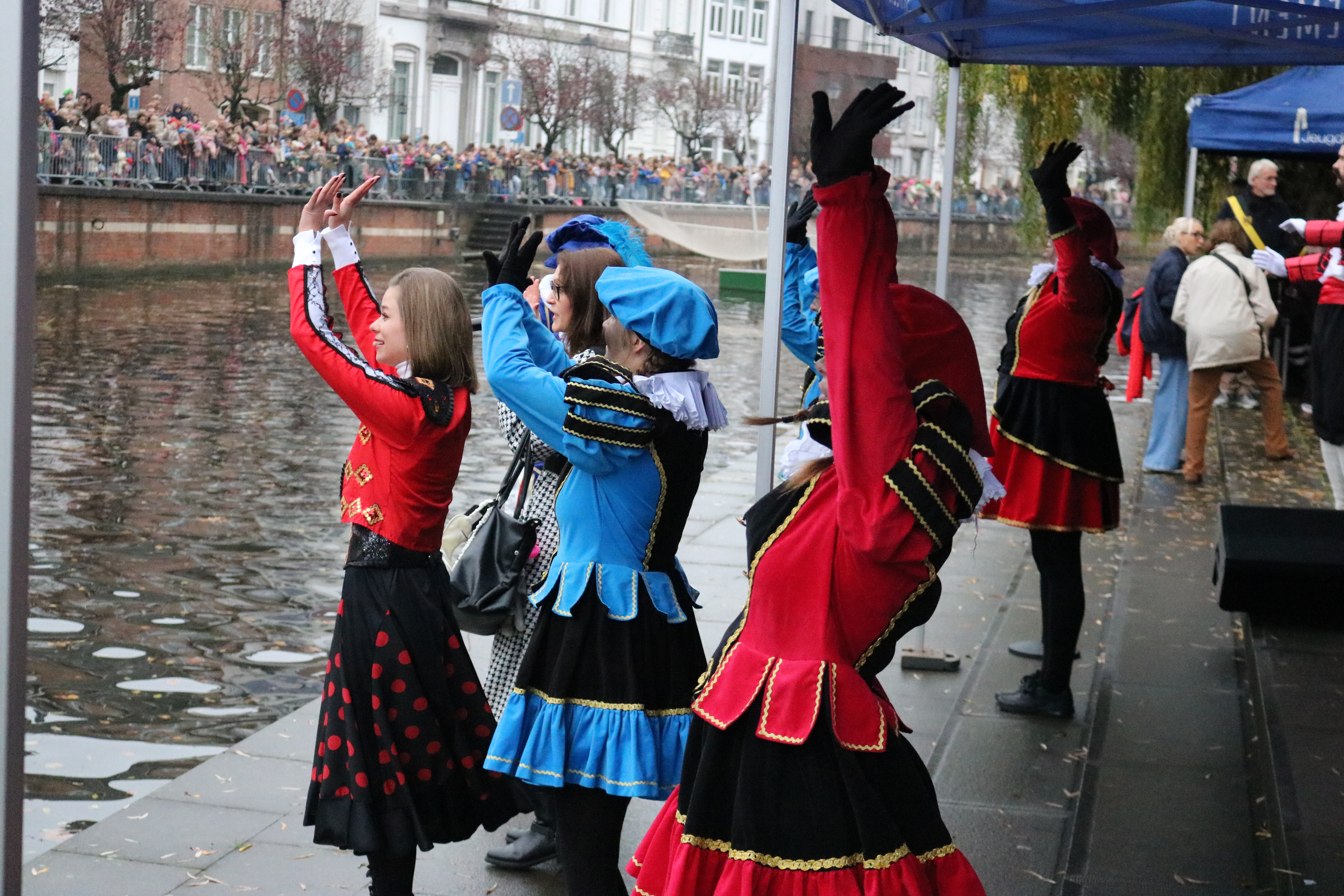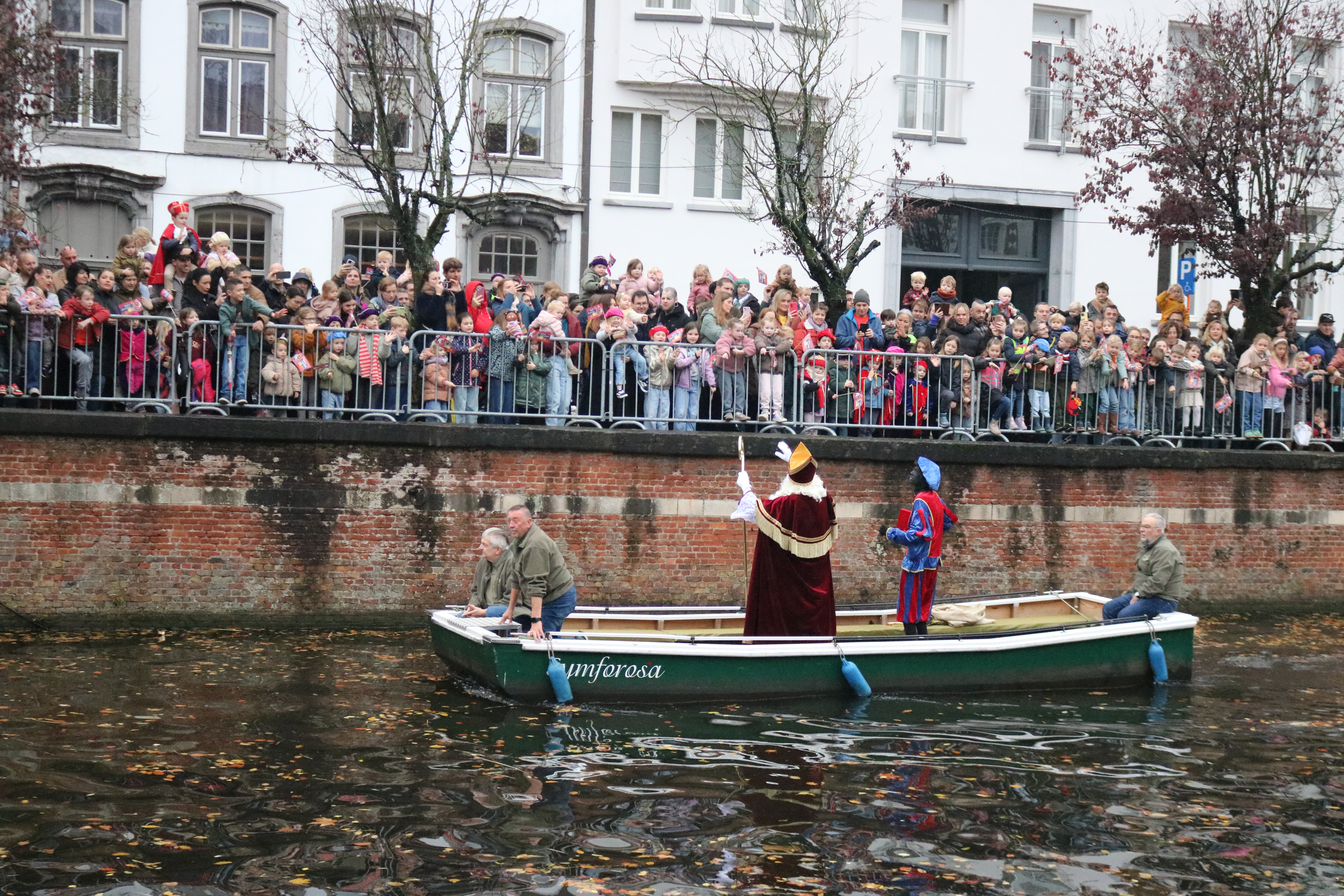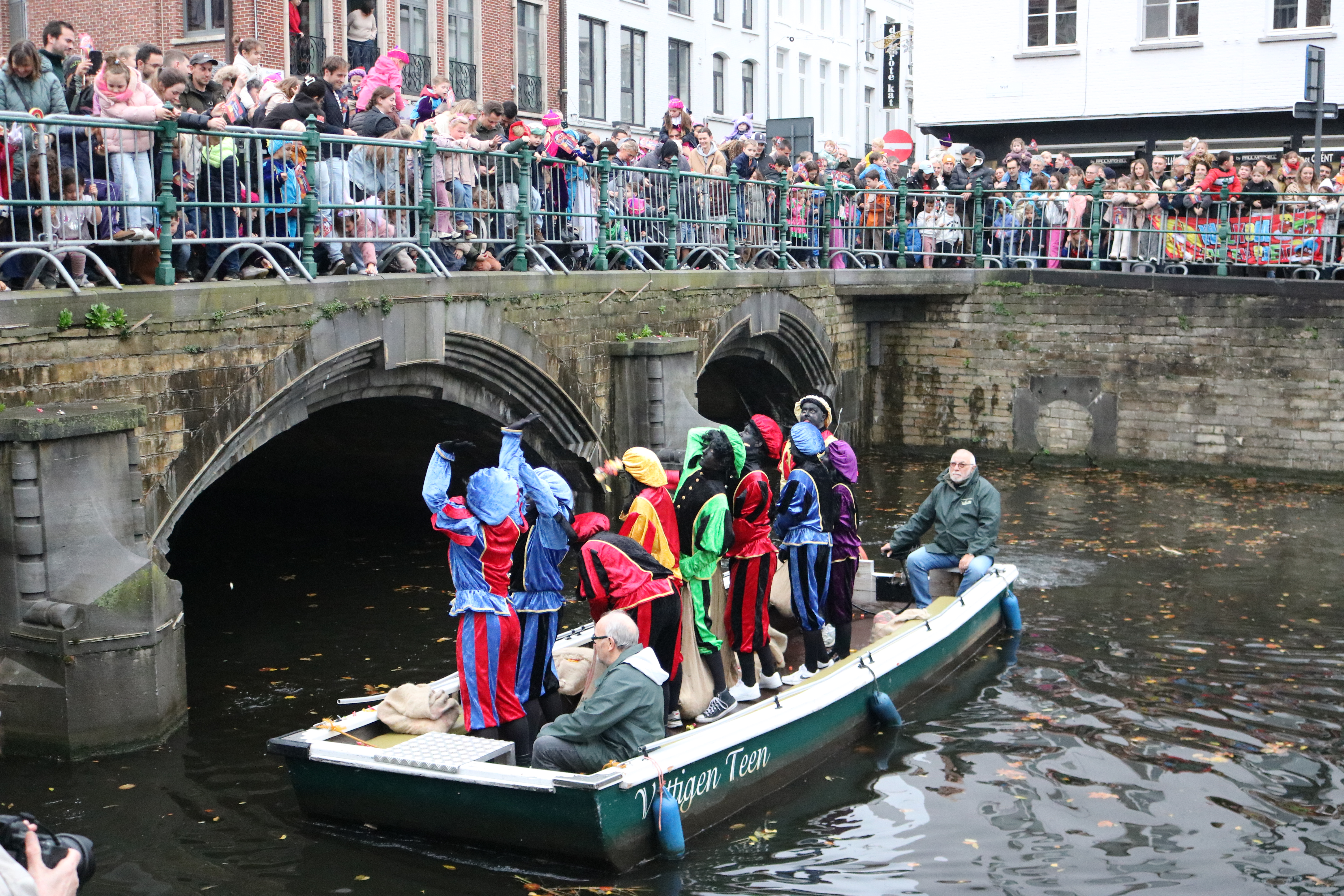 De Sint en zijn gevolg kwamen, begeleid door de druk gesticulerende Pieten, op traditionele wijze aan per boot. Een tweetal authentieke platbodems van de Moedige Bootvissers bracht hen over de Nete tot aan de verlaagde kade van het Felix Timmermansplein. De oevers, met de Werf en de Hoge Brug als uitkijkposten, waren afgeladen vol.