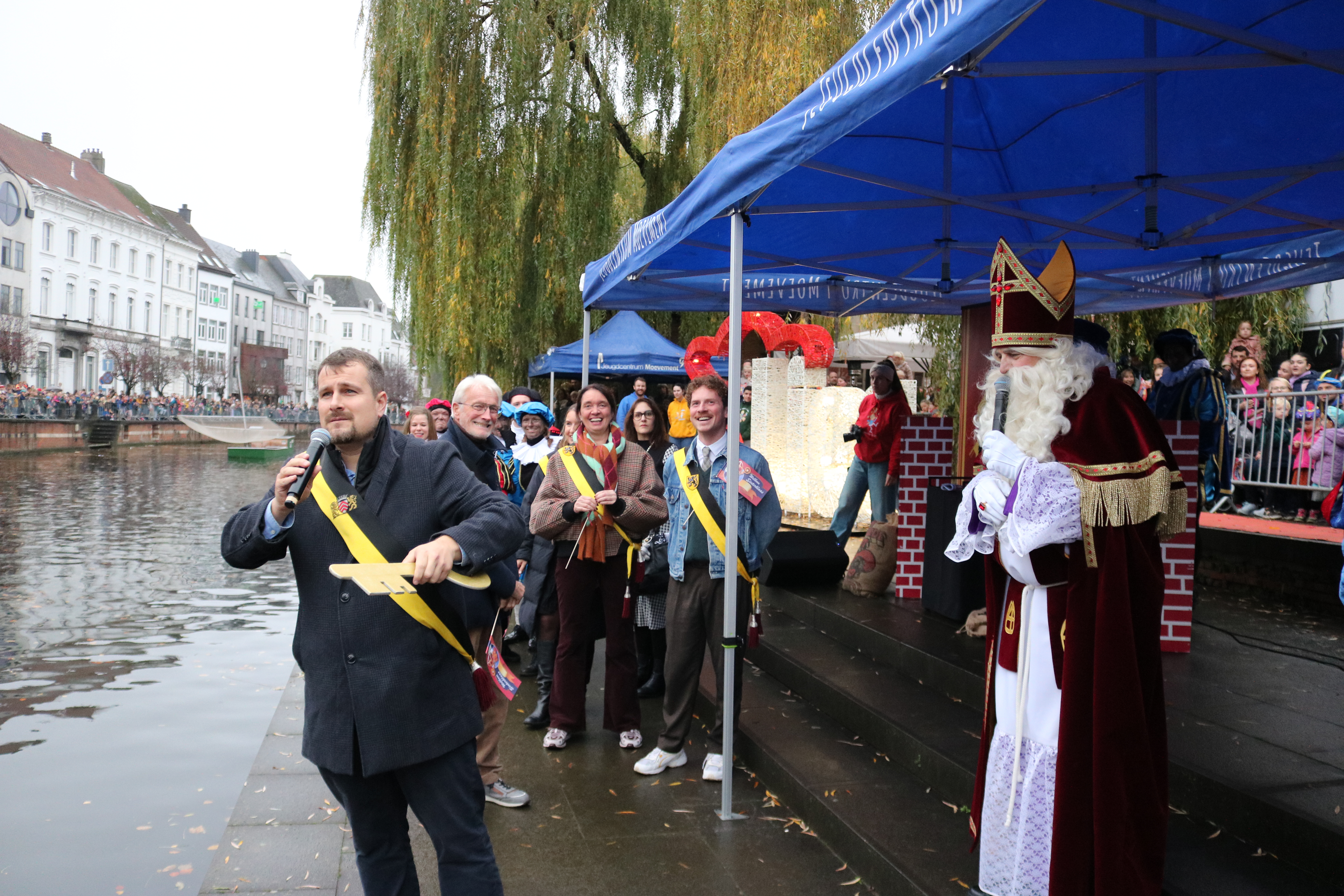 Op de kade werd Sinterklaas warm onthaald door een delegatie van het schepencollege, aangevoerd door burgemeester R. Verwaest.