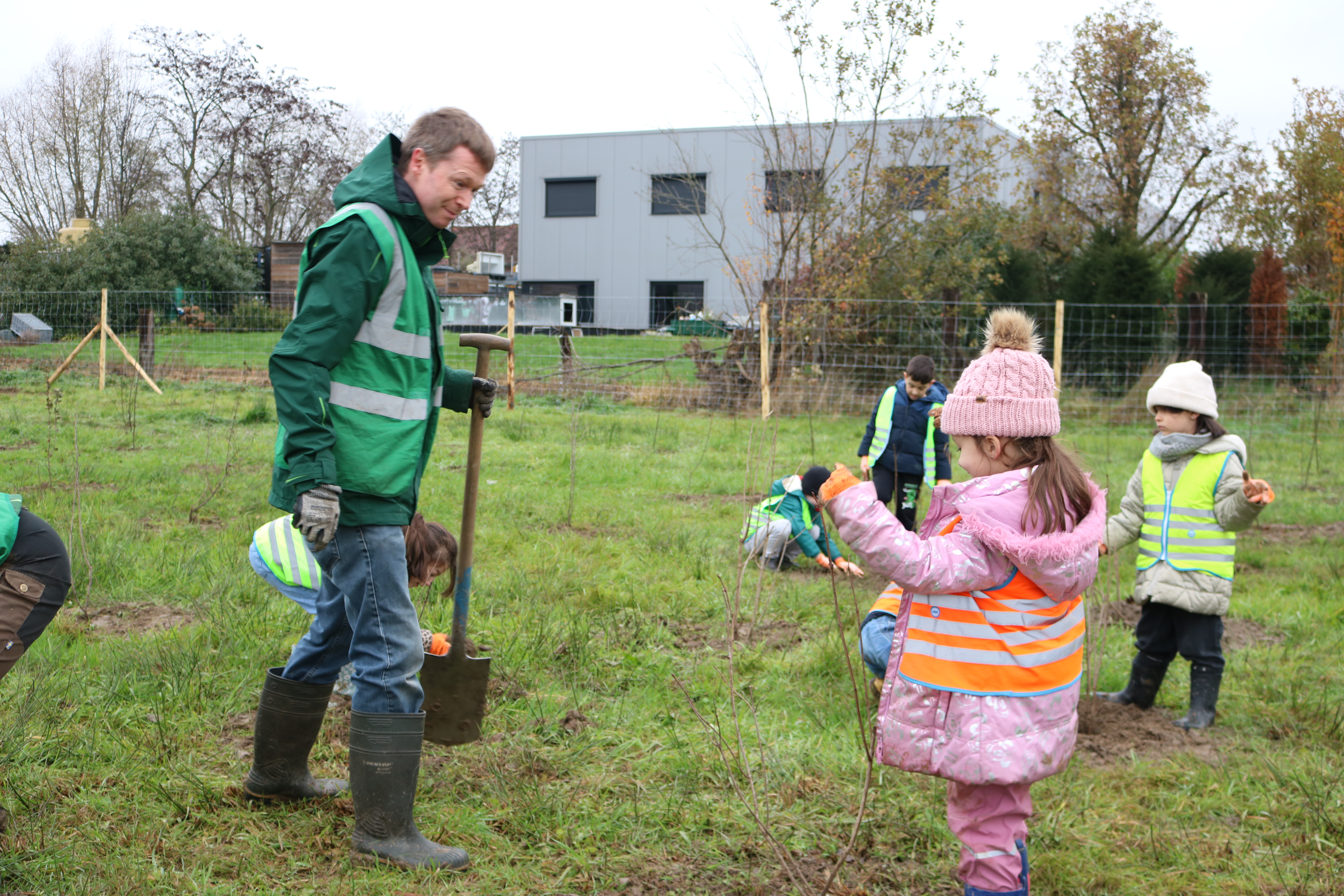 “We planten op het terrein een bos met in totaal 6.865 plantjes op een terrein van 3,25 hectare, met maar liefst 24 inheemse soorten planten,” legt medewerker van Bosgroep Matthias Vermeire uit.