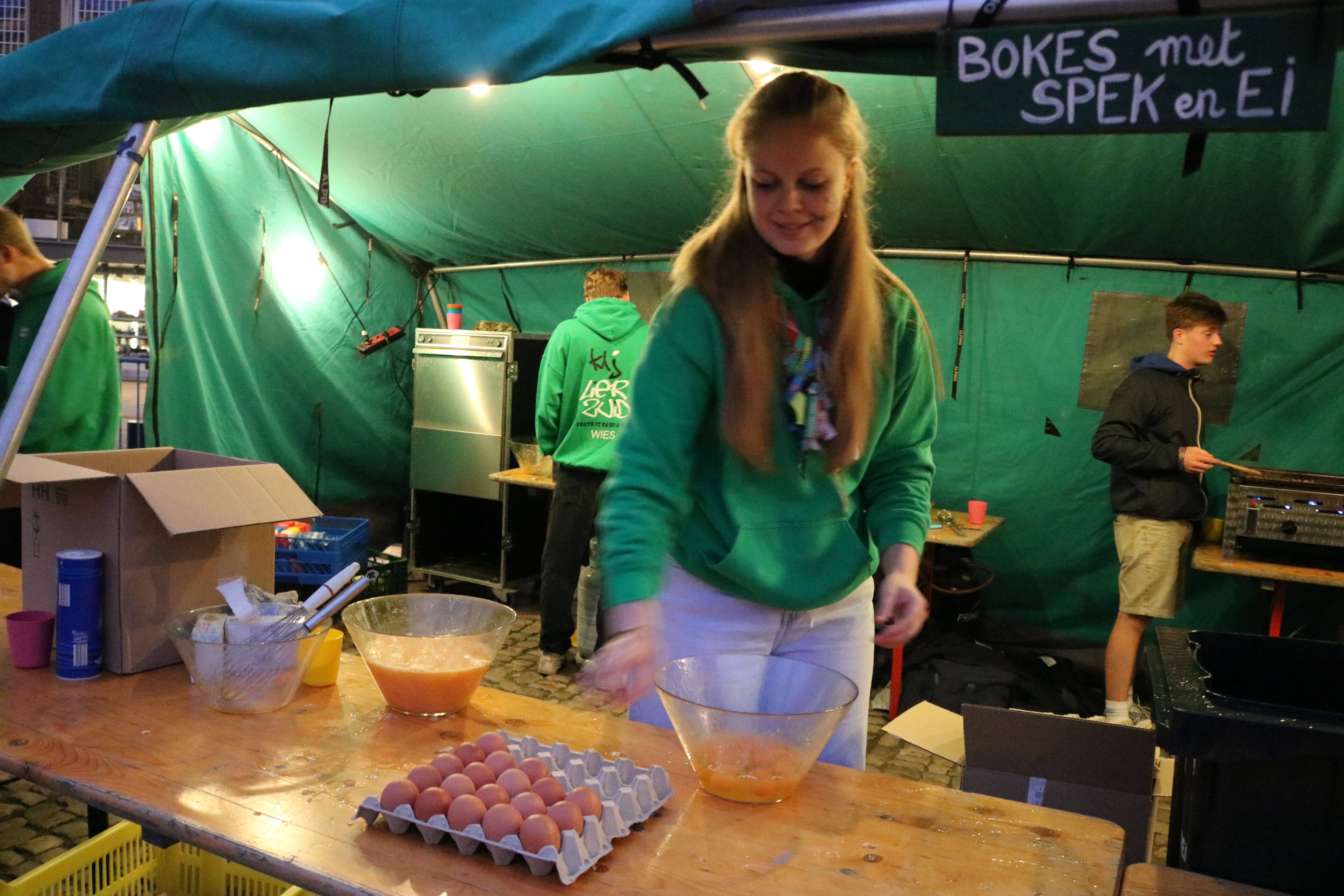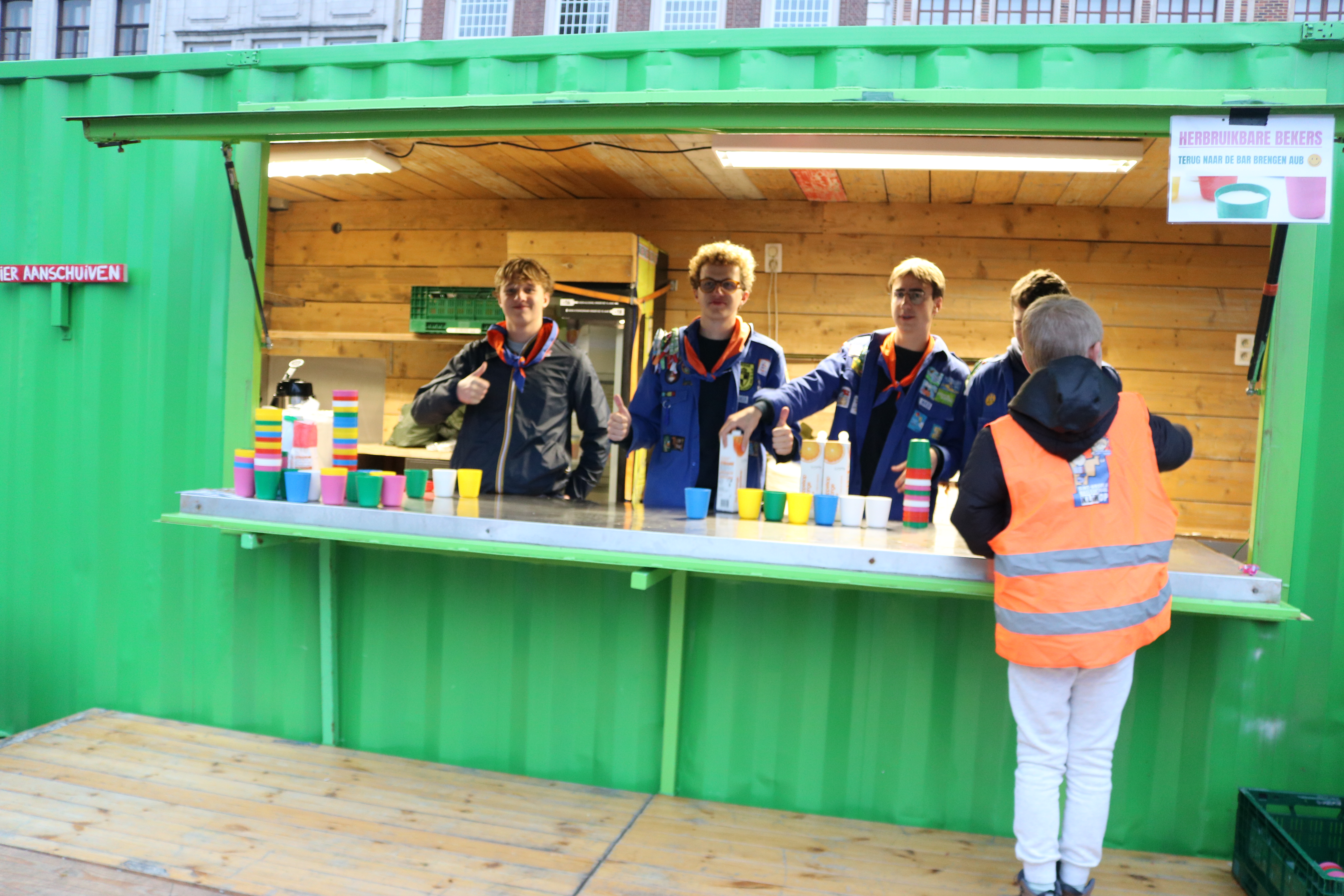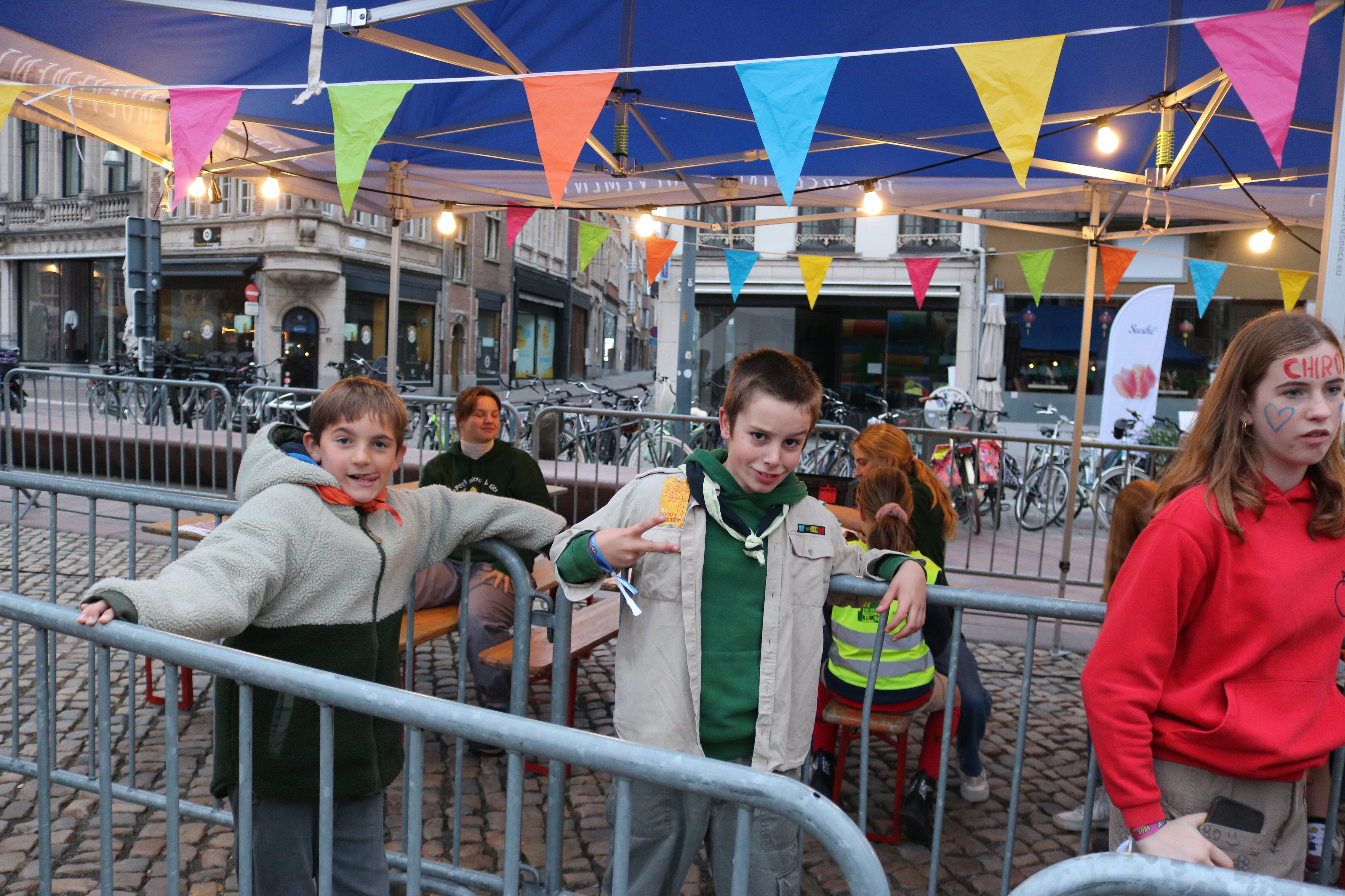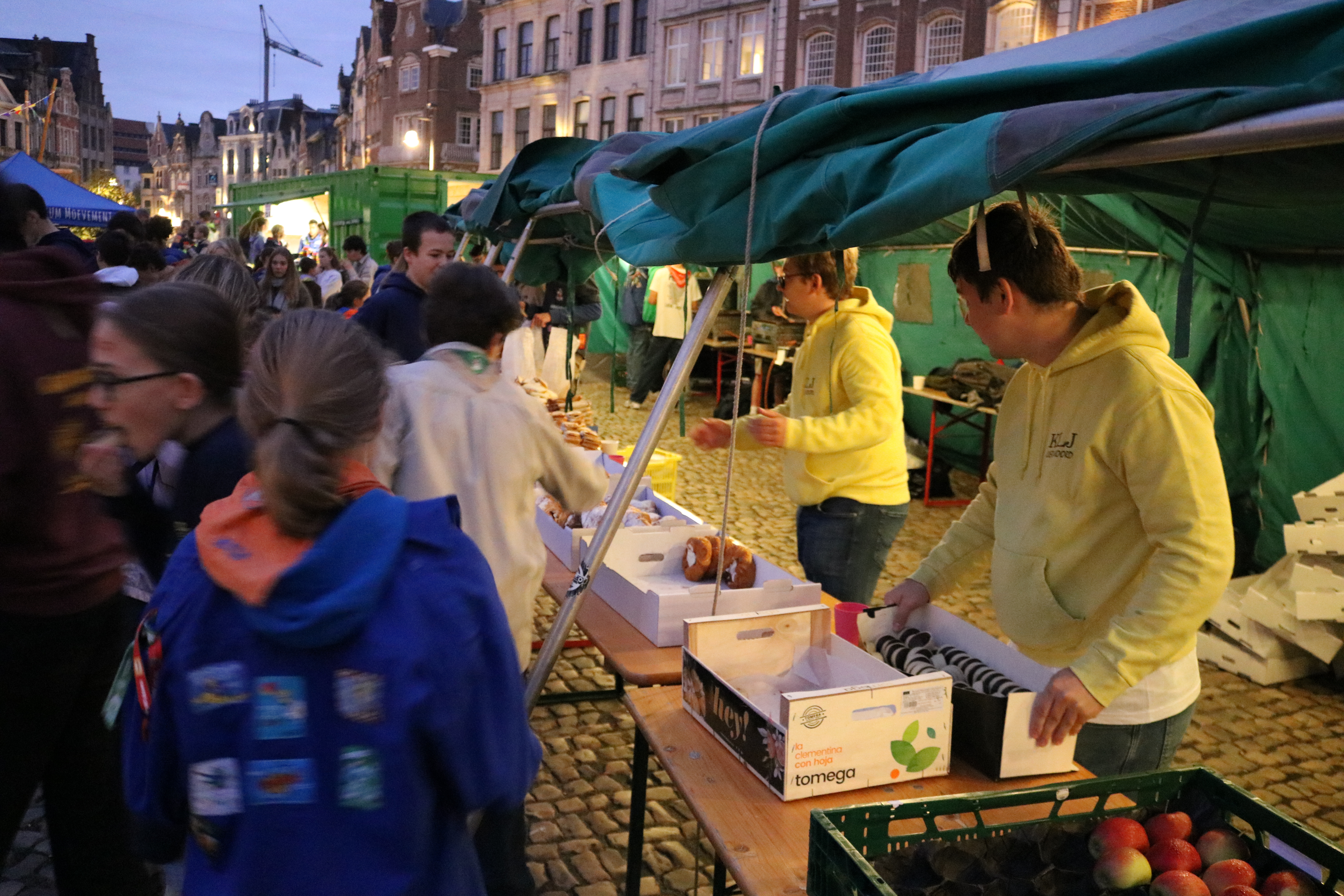 KLJ, Chiro, JTS, KSA, FOS, De Speelmicroob, Scouts en Gidsen palmden al vroeg in de ochtend de Grote Markt in en genoten van de koffiekoeken , boterhammen met eierkoek , een stuk fruit en een Liers Vlaaike als ontbijt.