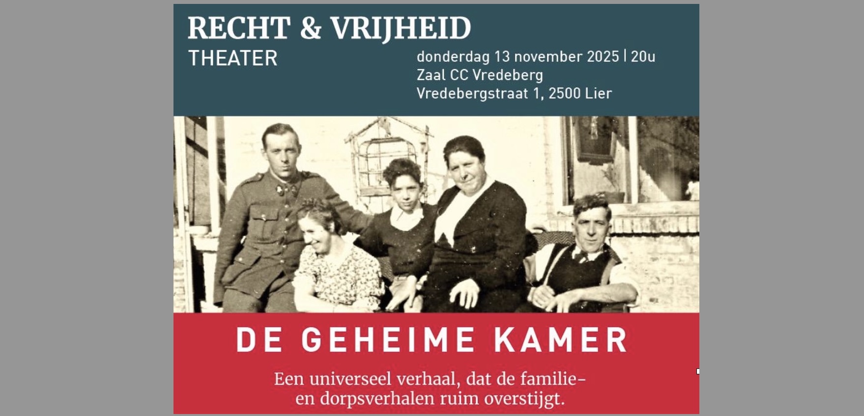 De Lierse vereniging Recht & Vrijheid, die de herinnering aan het verzet tijdens de Tweede Wereldoorlog levend houdt, organiseert naar aanleiding van Wapenstilstand 11 november een bijzondere toneelavond. Met de voorstelling ‘De Geheime Kamer’ brengt Jan Vanlangendonck het waargebeurde verhaal van zijn familie die tijdens WO II actief was in het verzet.