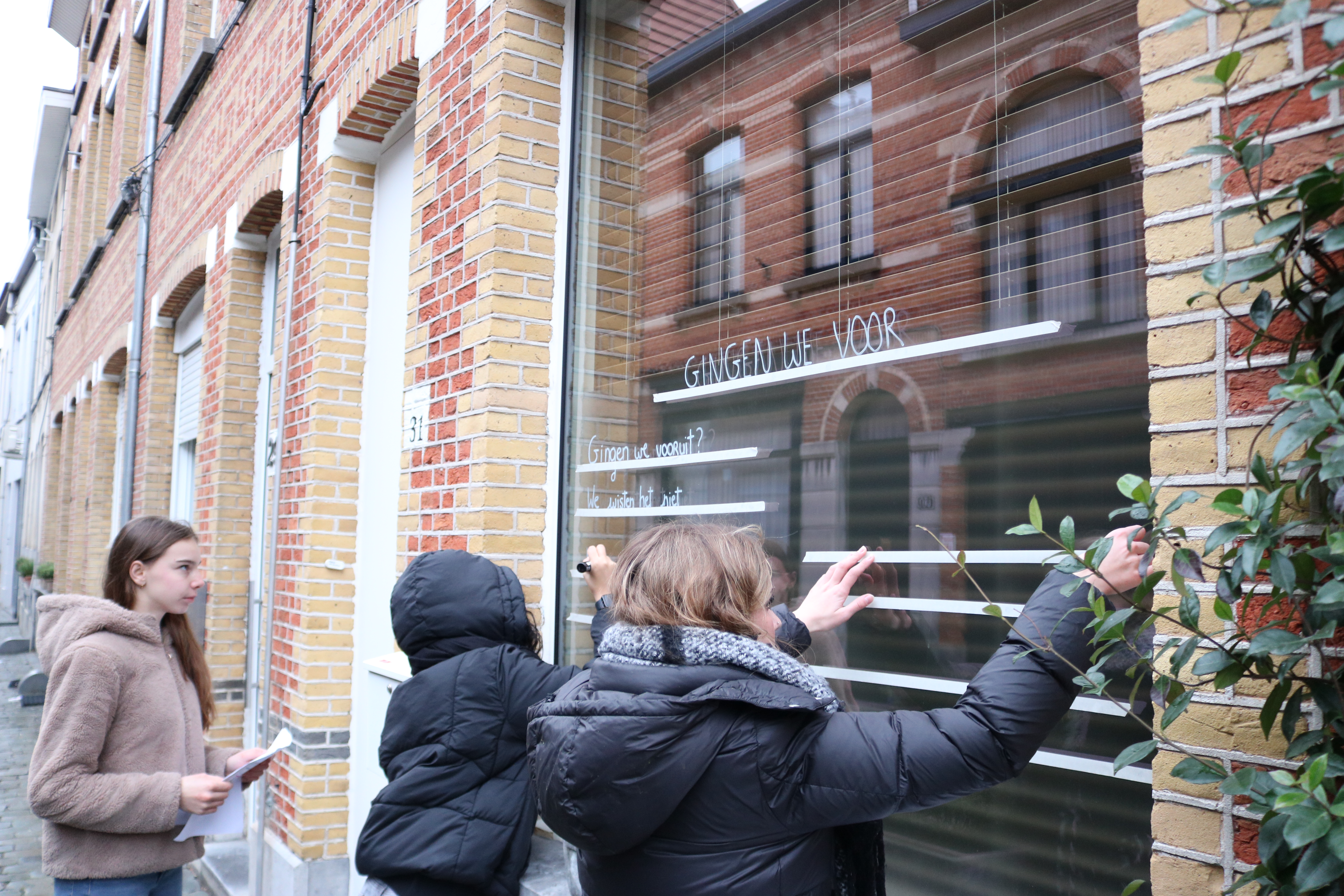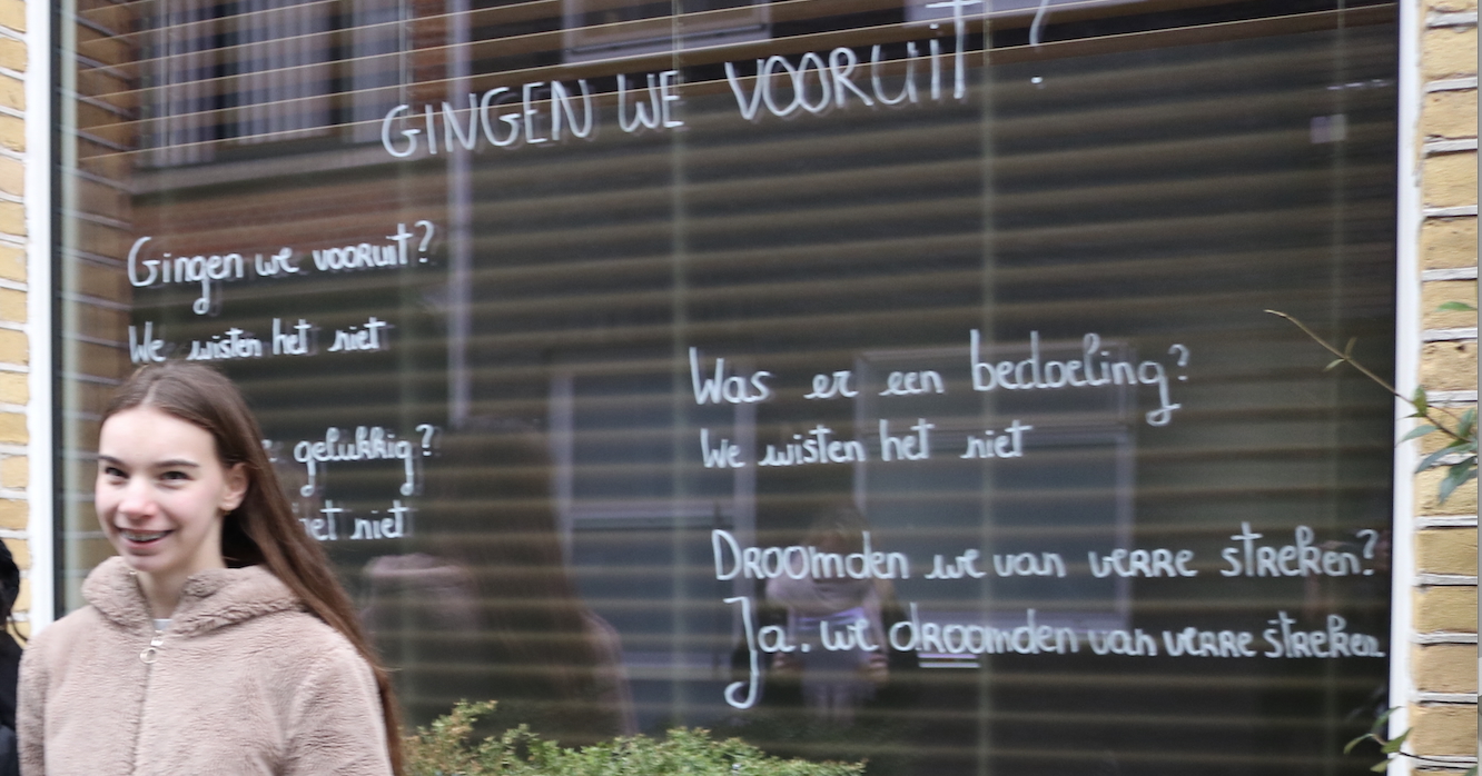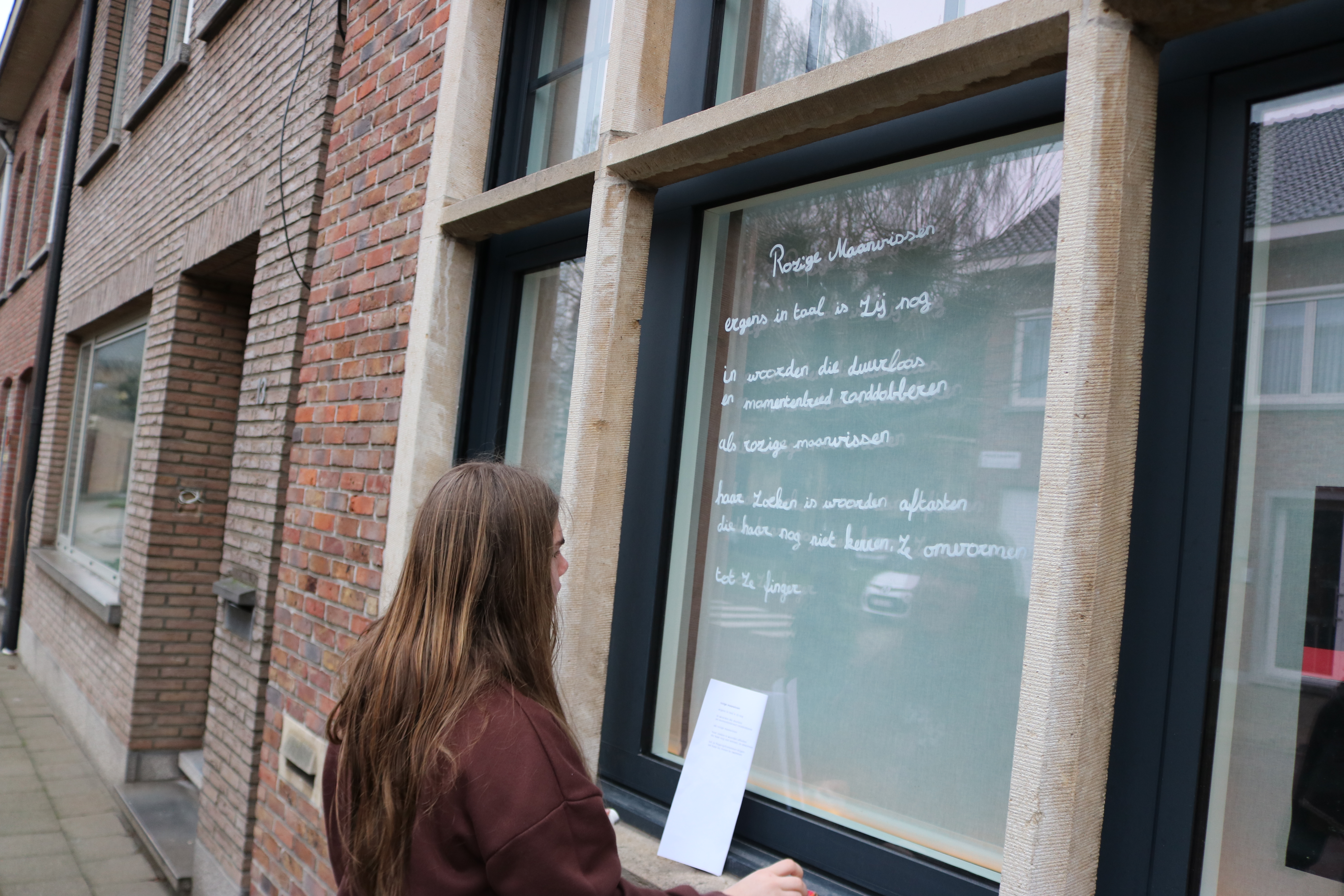 Ook enkele scholen doen mee. Zo trok deze morgen het vijfde jaar arbeidsmarktgerichte finaliteit van Atheneum Lier, Campus Louis Zimmer begeleid door hun leerkracht in twee groepjes op pad om gewapend met afwasbare stift hun gedicht „Rozige maanvissen” van Kees van Domselaar en „Gingen we vooruit? ” van Sytse Jansma op een vensterraam in ‘t Looks aan te brengen .