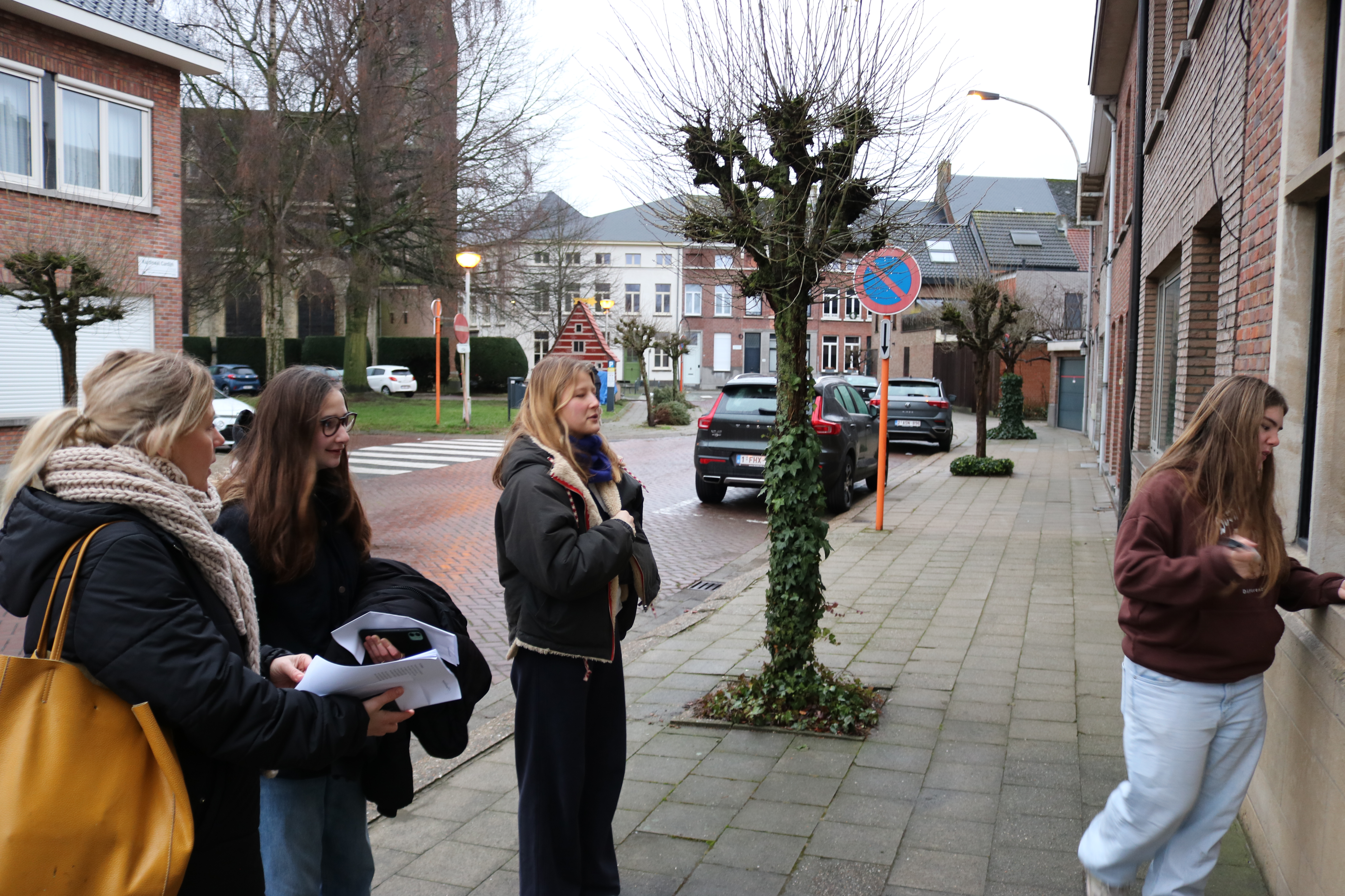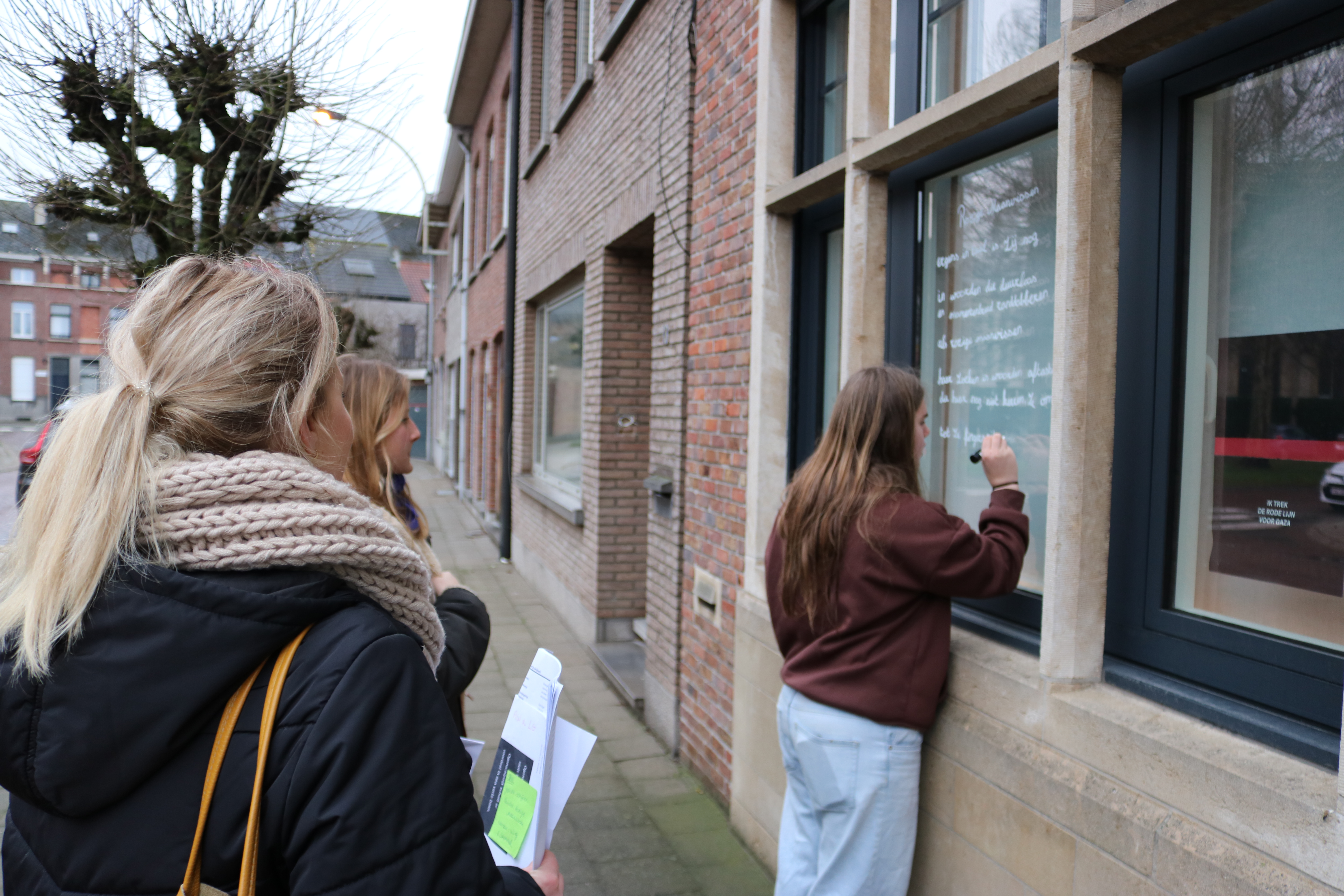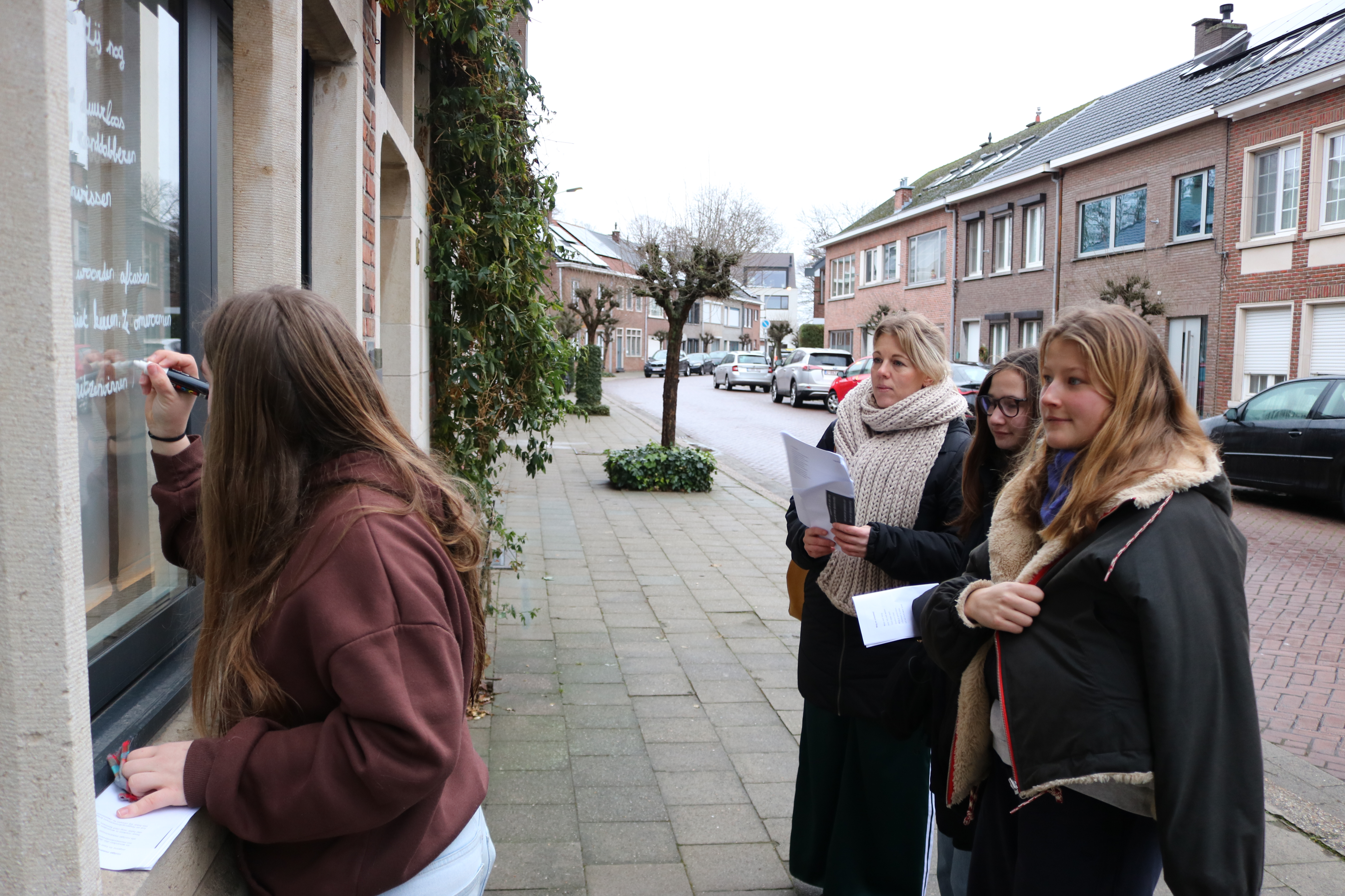 Ook enkele scholen doen mee. Zo trok deze morgen het vijfde jaar arbeidsmarktgerichte finaliteit van Atheneum Lier, Campus Louis Zimmer begeleid door hun leerkracht in twee groepjes op pad om gewapend met afwasbare stift hun gedicht „Rozige maanvissen” van Kees van Domselaar en „Gingen we vooruit? ” van Sytse Jansma op een vensterraam in ‘t Looks aan te brengen .