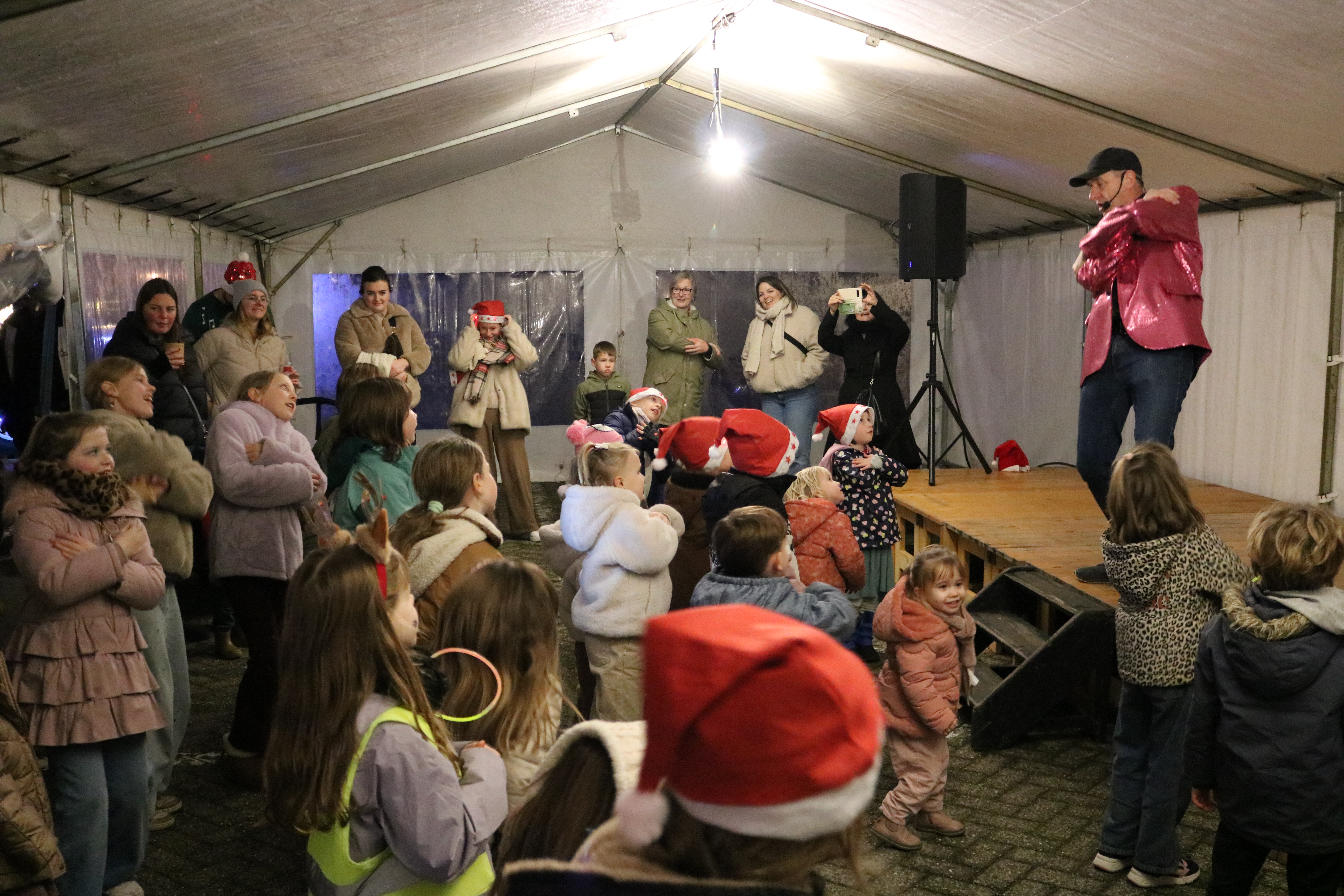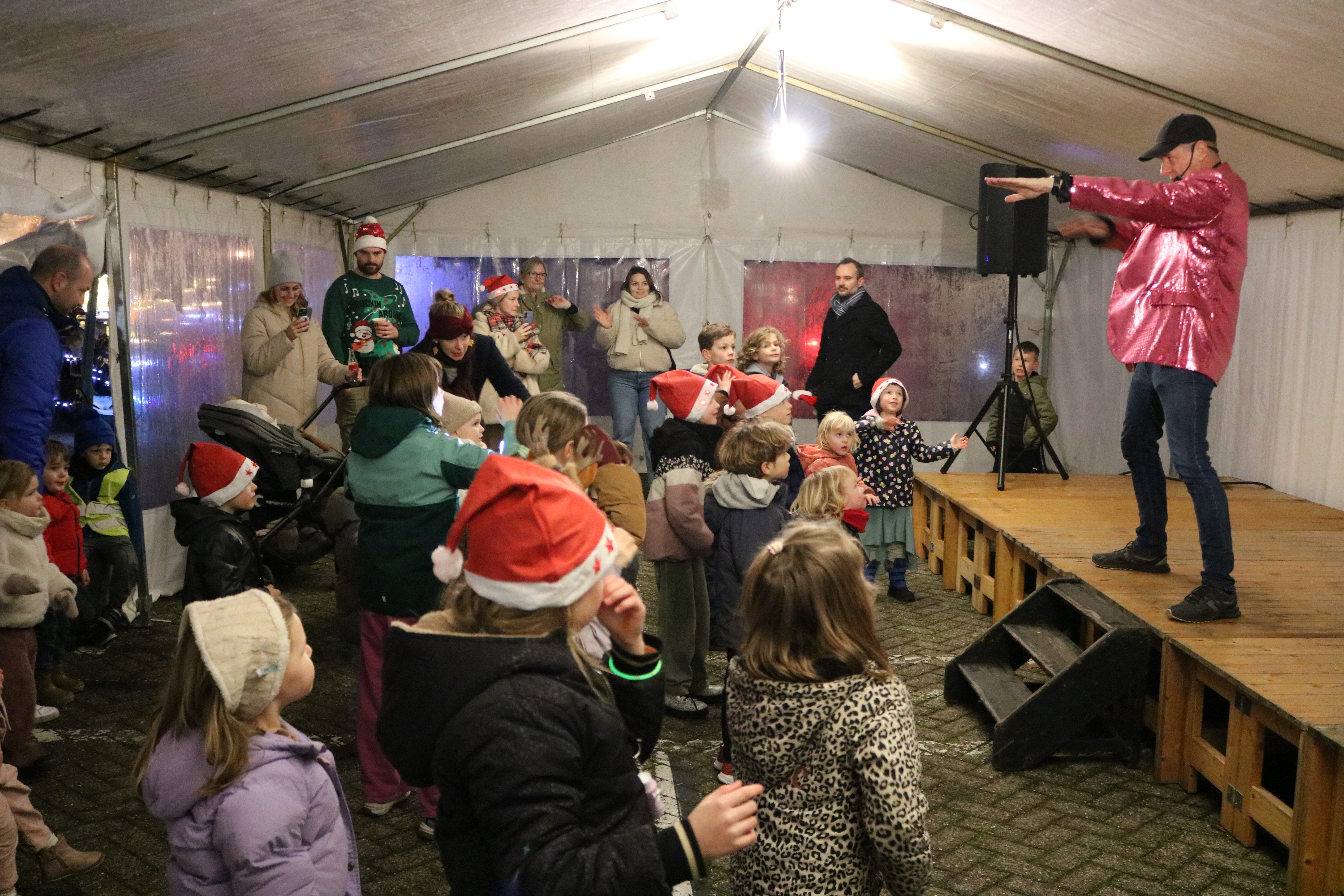 Ballonkunstenaar Clown Fiebel maakte zijn opwachting in de verwarmde tent en meteen was de pret gegarandeerd tijdens de kinderdisco.