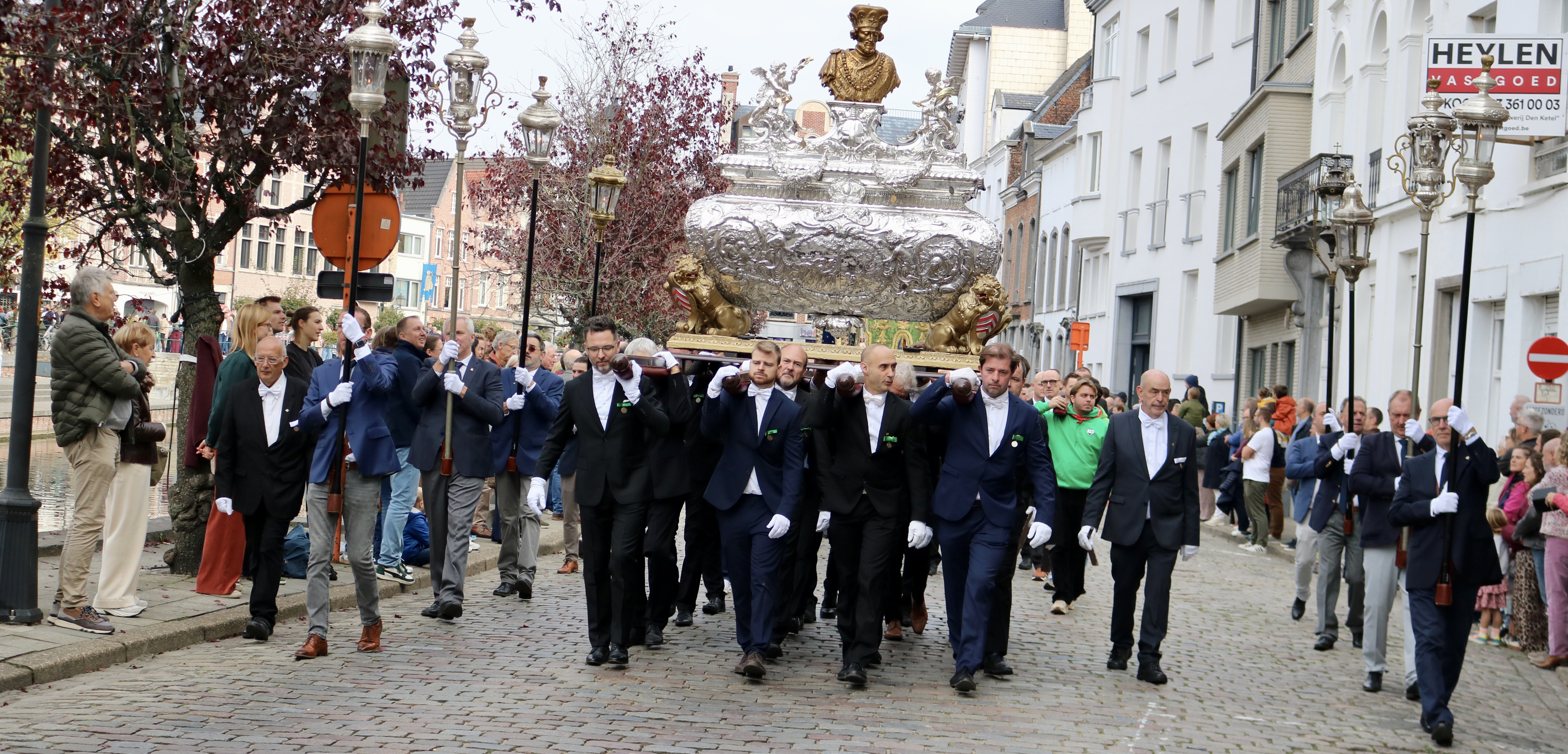 Blikvanger van de processie blijft uiteraard het meer dan 800 kg zware zilveren reliekschrijn dat door zestien leden van het Genootschap van de Kasdragers wordt gedragen .