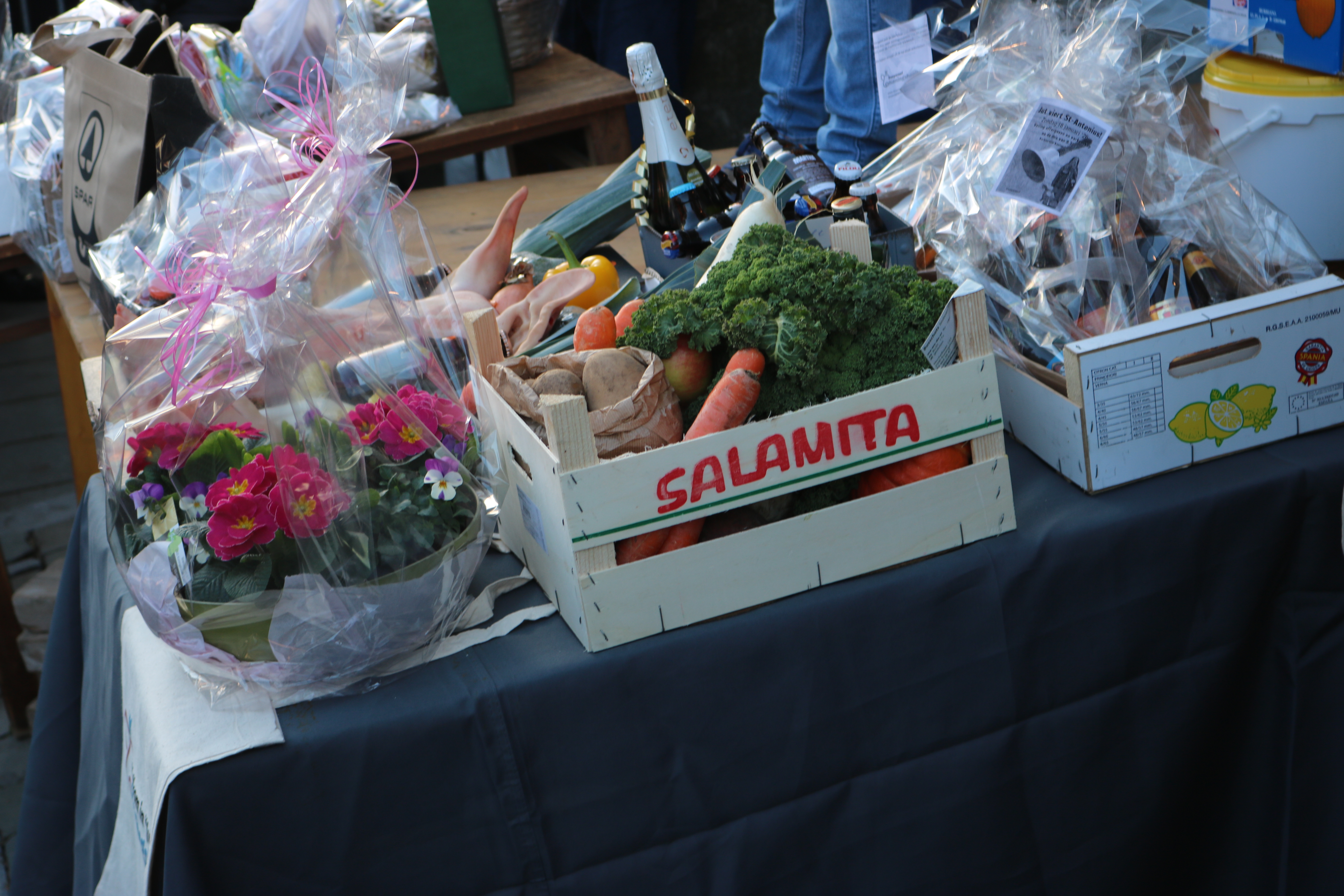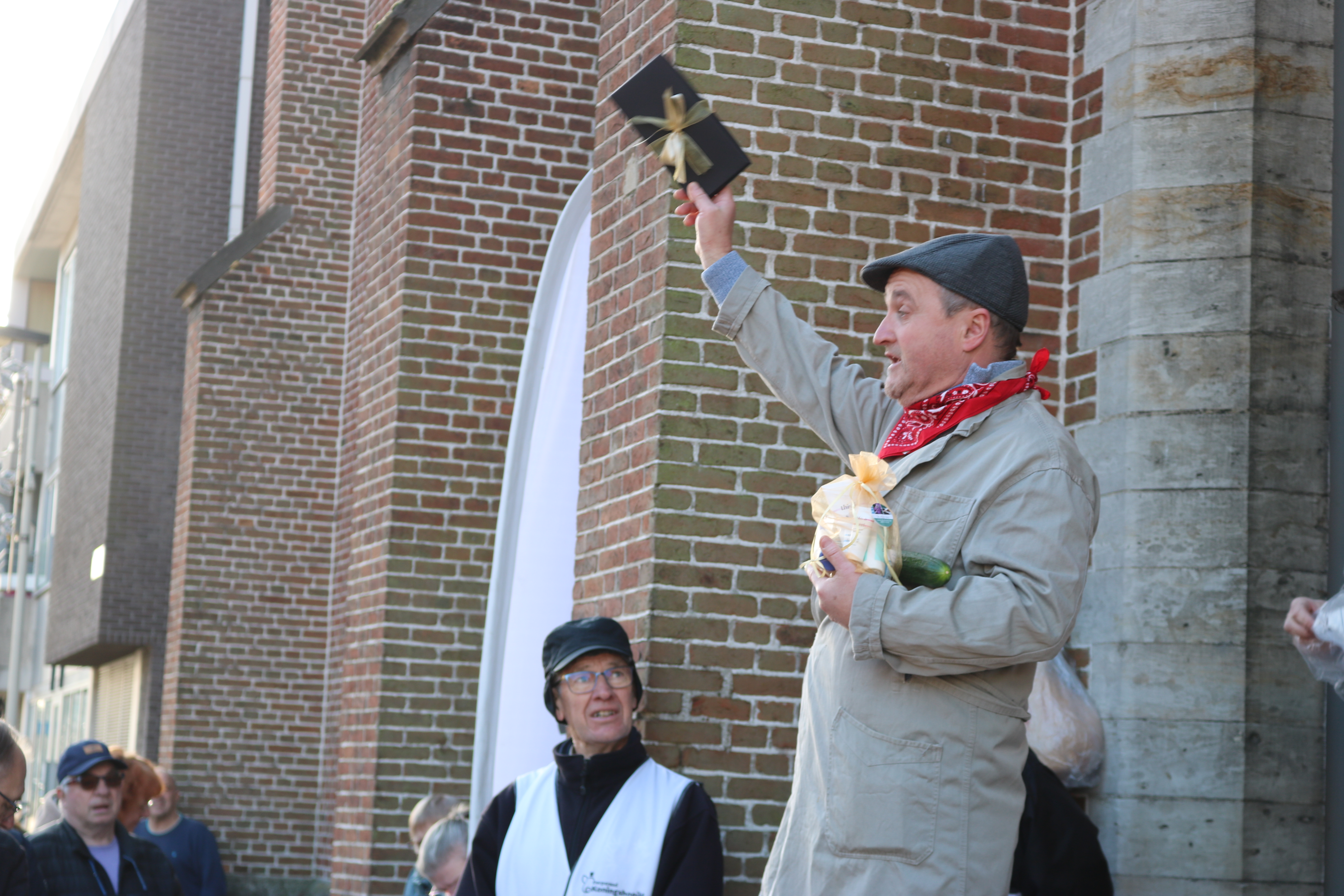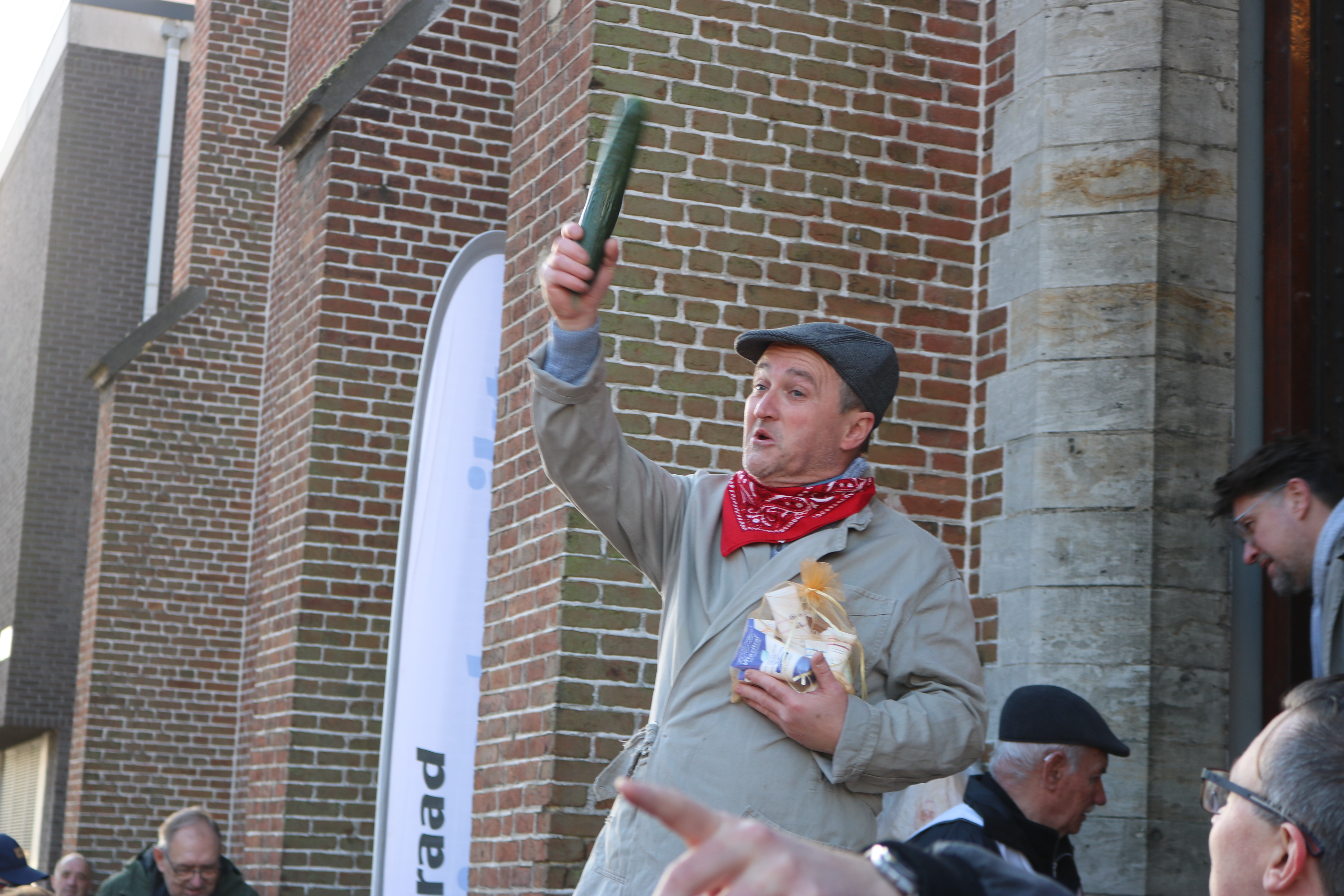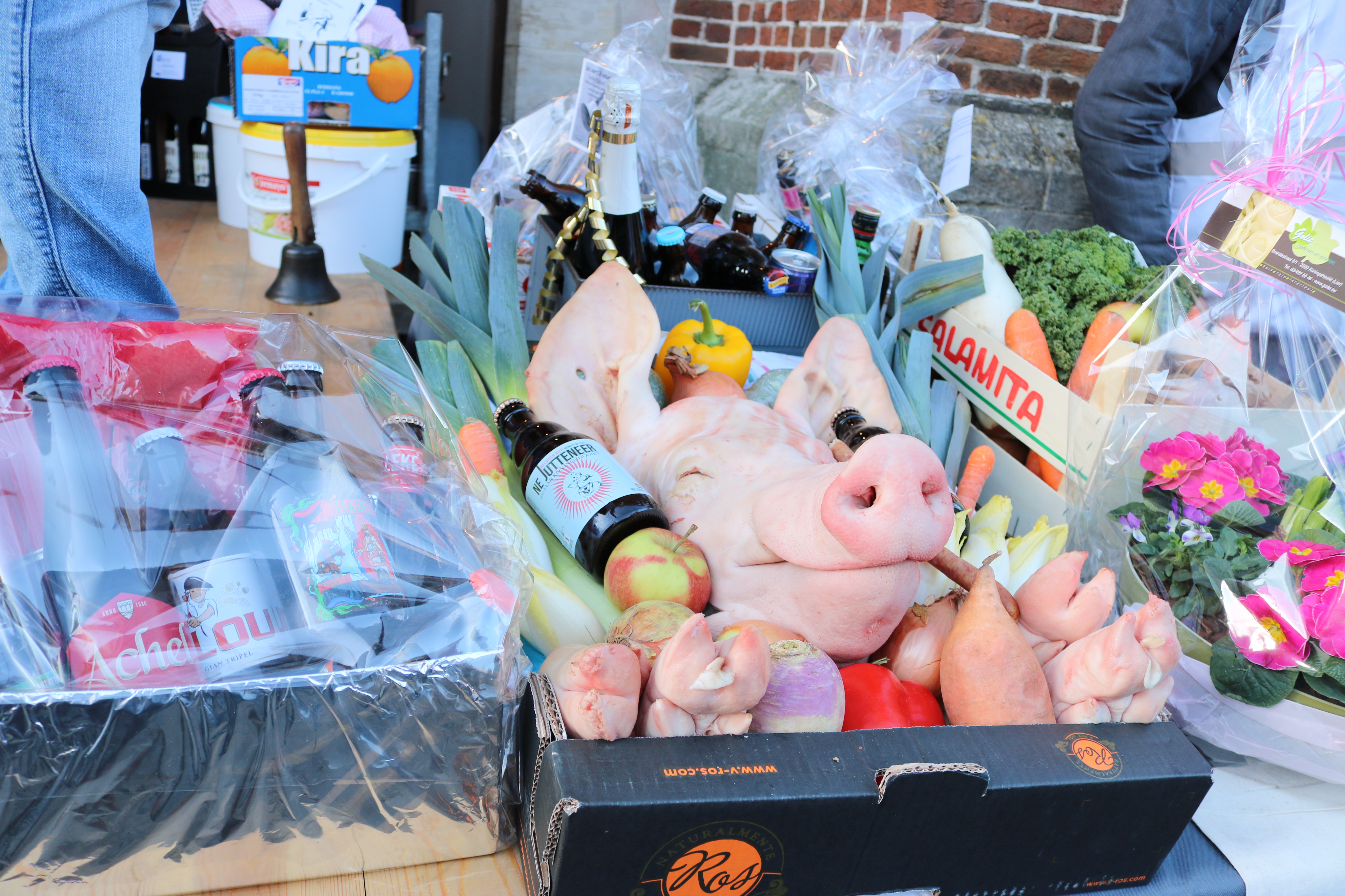 Na de misviering werd om 10:30 uur de ruime oogst van liefst 70 offergaven van de Hooiktse gemeenschap naar het voorportaal gebracht waar onder ruime belangstelling van de Jutteneers de groenten- en fruitkorven, pensen, hespen, taarten en ijstaarten ,rozijnen-en boerenbroden, dranken en uiteraard de onvermijdelijke varkenskop met een kwinkslag werden geveild door gelegenheidsveilingmeester en voorzitter van de gemeenteraad Thierry Suetens. De verkoop bracht meer dan 4.000 euro op.