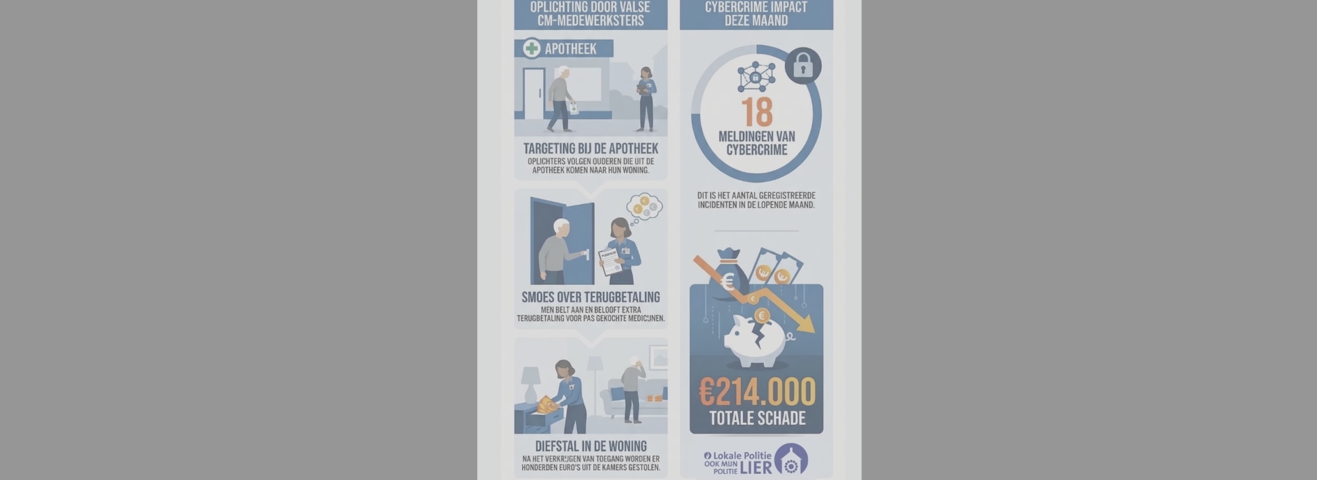 Naast fysieke diefstallen ziet de politiezone Lier ook een sterke toename van cybercrime. Deze maand zijn al 18 meldingen van cybercrime geregistreerd en werd in totaal 214.000 euro ontvreemd.